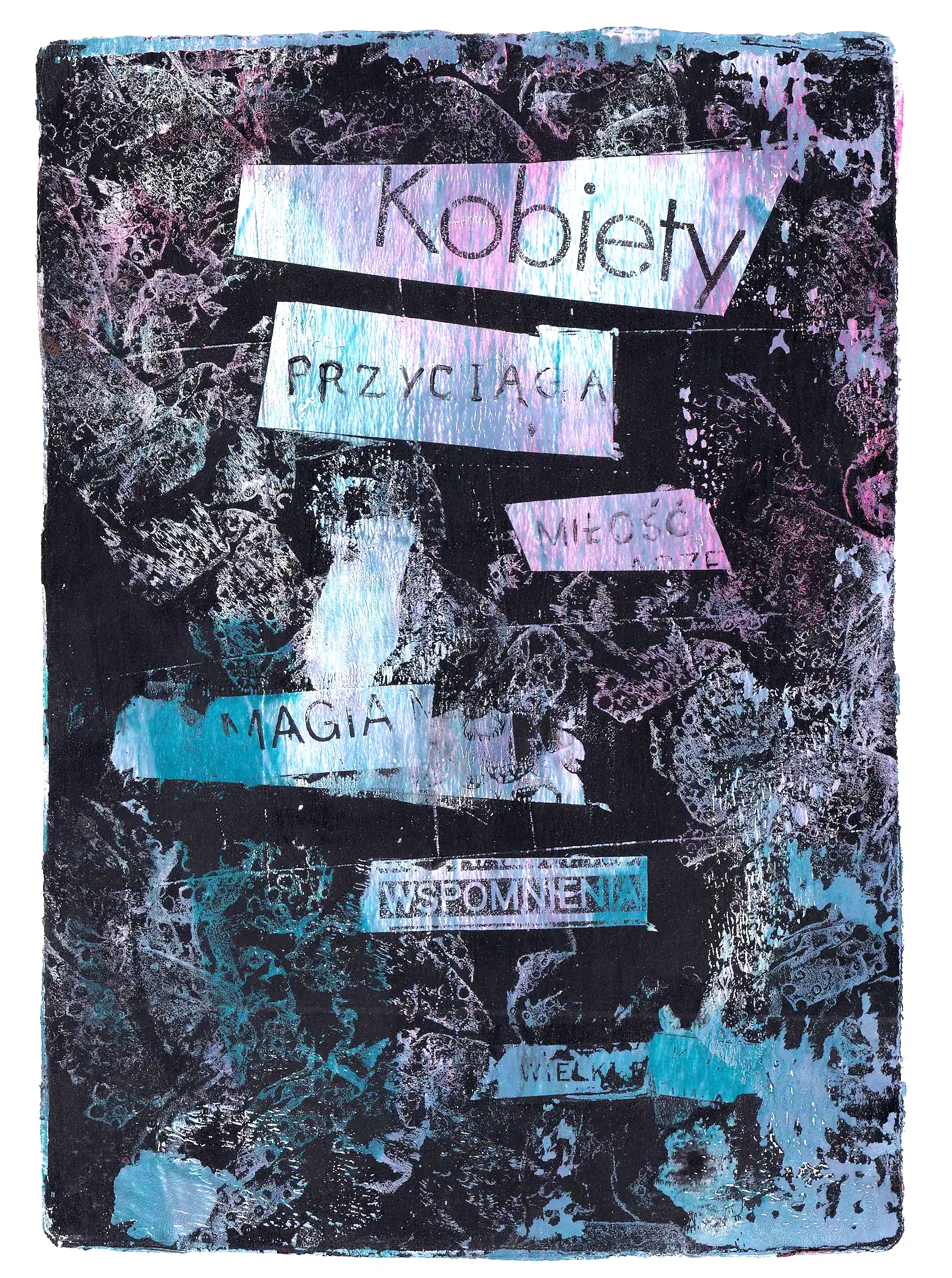 Przyciąganie – grafika wykonana ręcznie w technice monotypii, łącząca elementy grafiki oraz kolażu literackiego. Kompozycja została stworzona z...