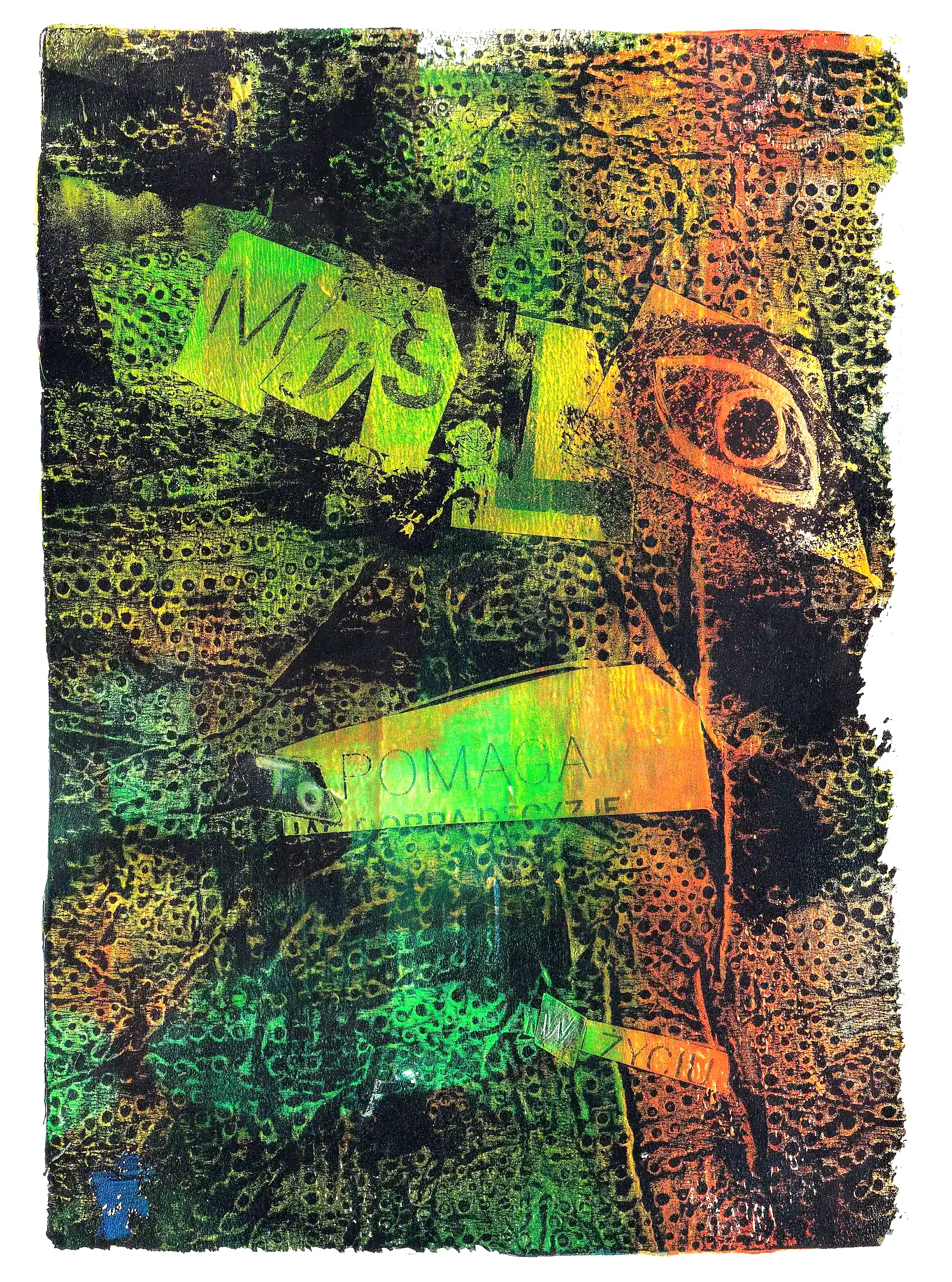 Myślenie pomaga – grafika wykonana ręcznie w technice monotypii, łącząca elementy grafiki oraz kolażu literackiego. Kompozycja została stworzona...