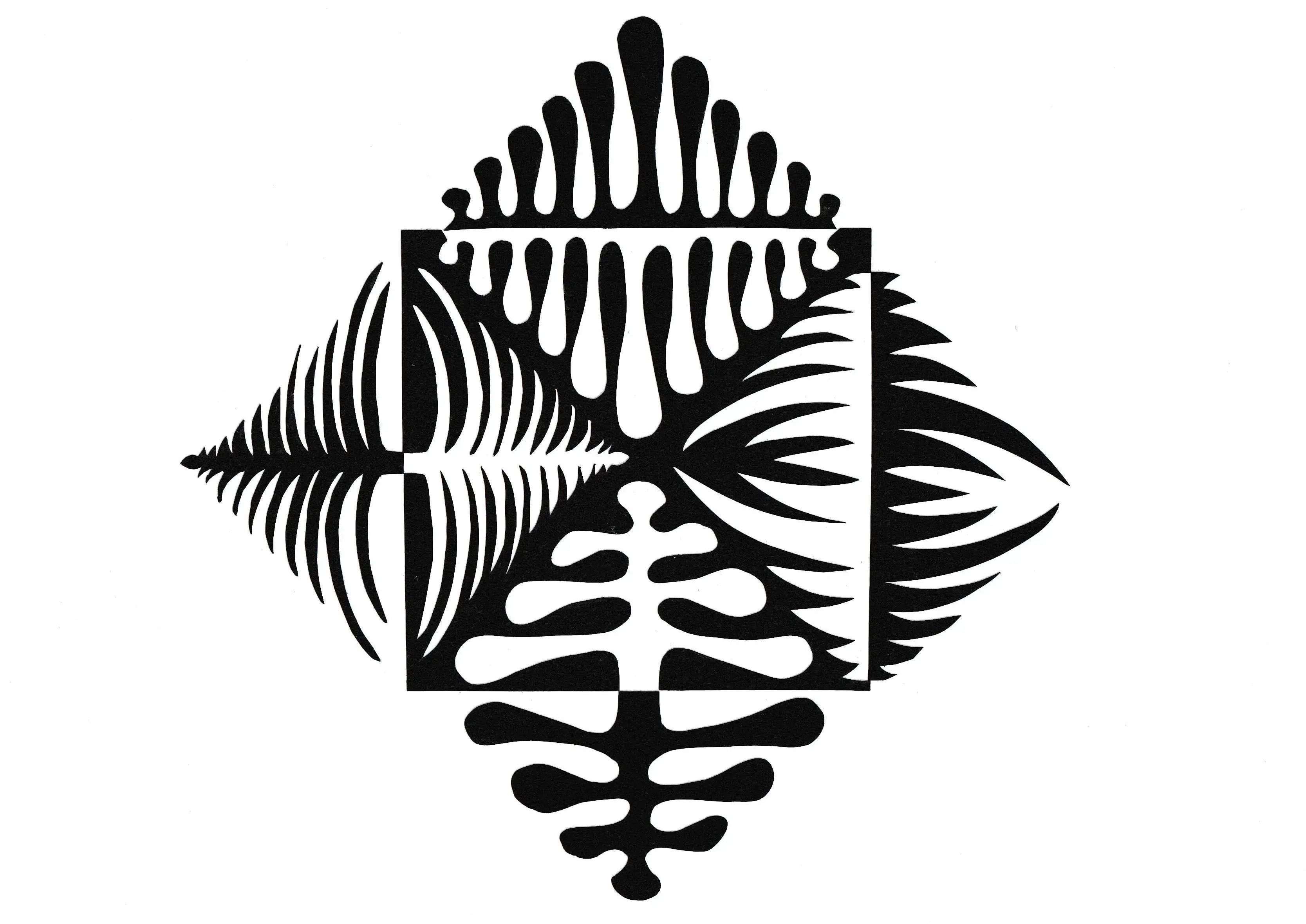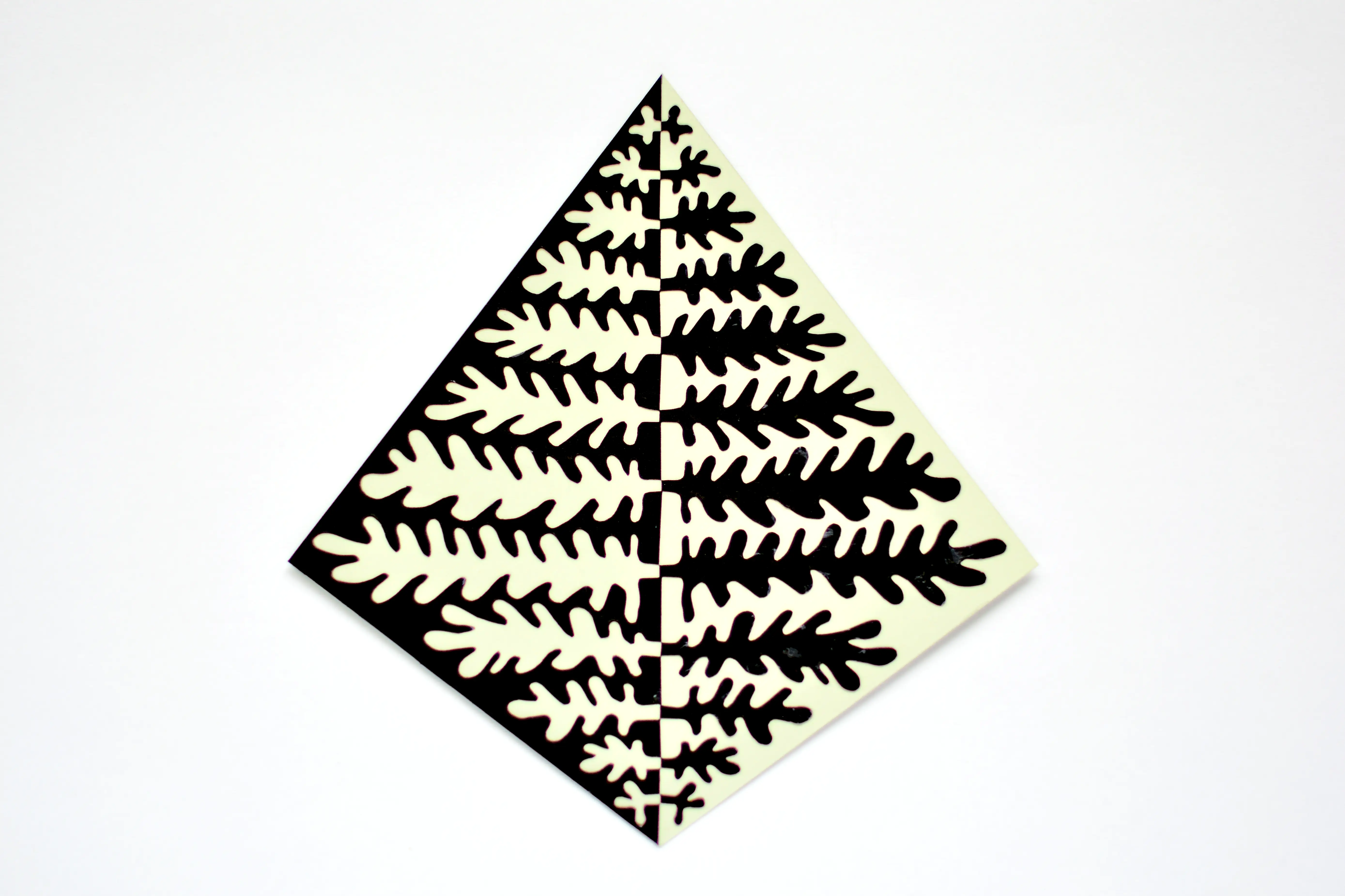 Filiko – notan w formie kremowo-czarnej wycinanki z papieru w kształcie deltoidu, zainspirowany pełnymi detali i zawijasów liśćmi...