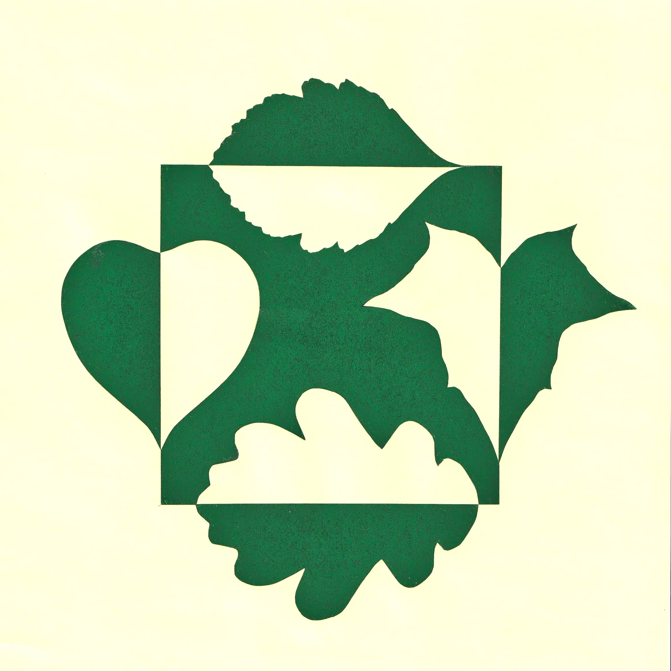 Hojas – notan w formie kremowo-zielonej wycinanki z papieru, przedstawiającej liście czterech gatunków drzew: dębu szypułkowego (łac. Quercus...