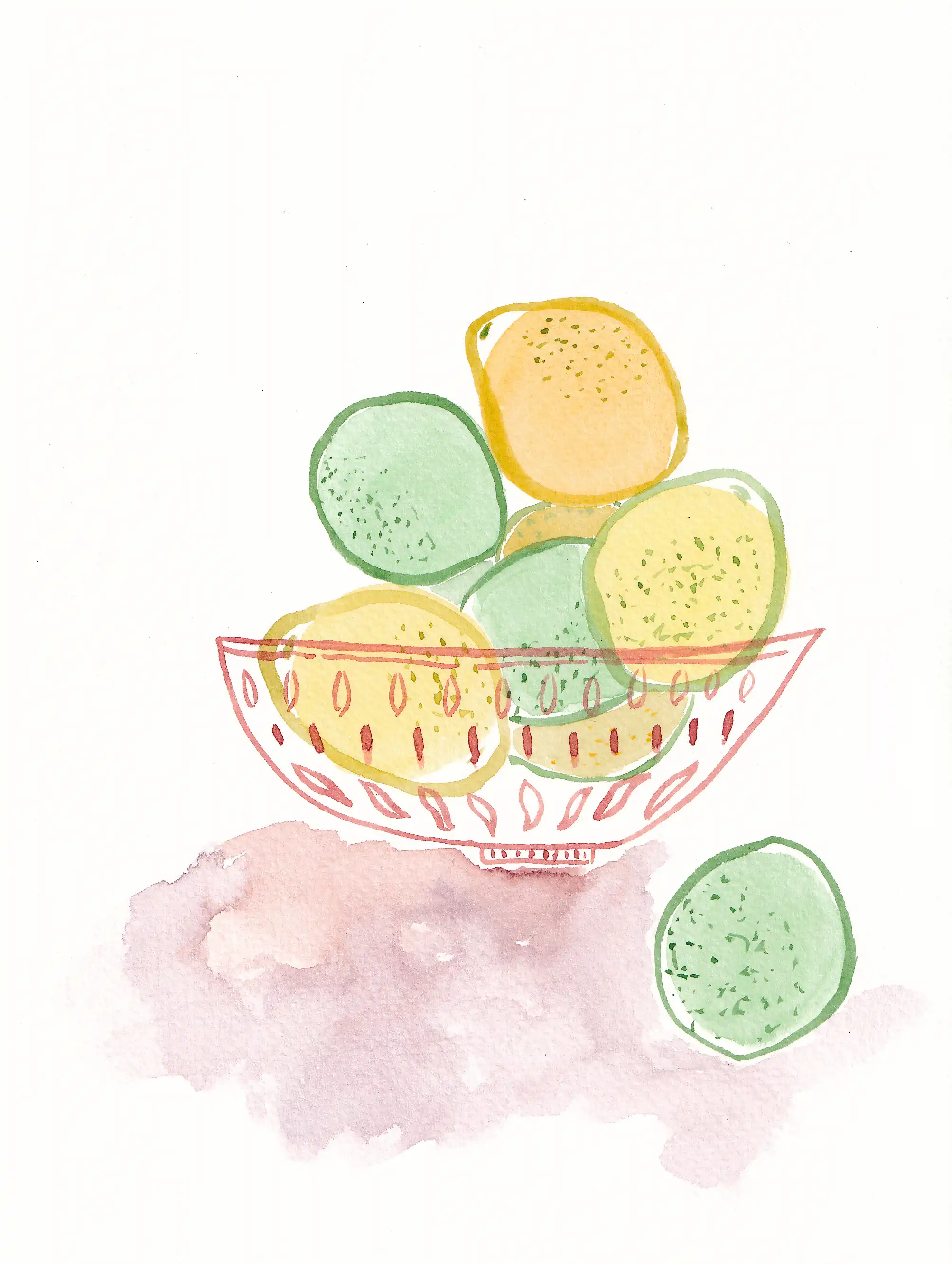 Cytrynki – obraz wykonany w technice akwareli. Luźna, minimalistyczna interpretacja motywu cytryn ułożonych w szklanej misie. Obfitość owoców,...