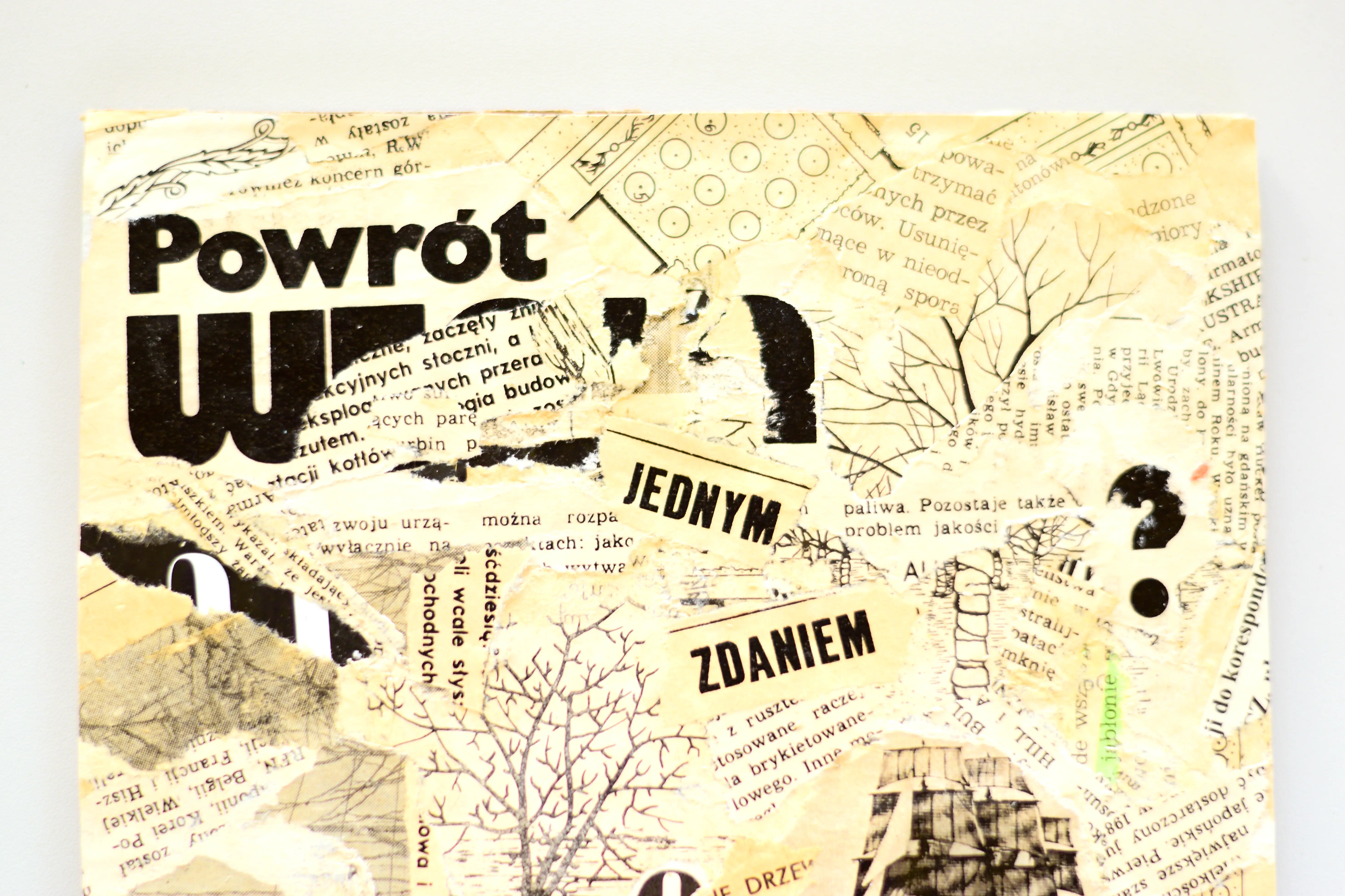 Głęboka, lekko błyszcząca czerń druku magazynowego kontrastuje z matowością i jaśniejszym odcieniem druku książkowego. Monochromatyczność dekolażu w kilku miejscach została przełamana przez znajdujące się w wykorzystanej książce elementy zaznaczone kiedyś przez kogoś neonowo zielonym zakreślaczem. Planowanie przeplata się z nieprzewidywalnością, historia ze współczesnością, a słowa z gałązkami.