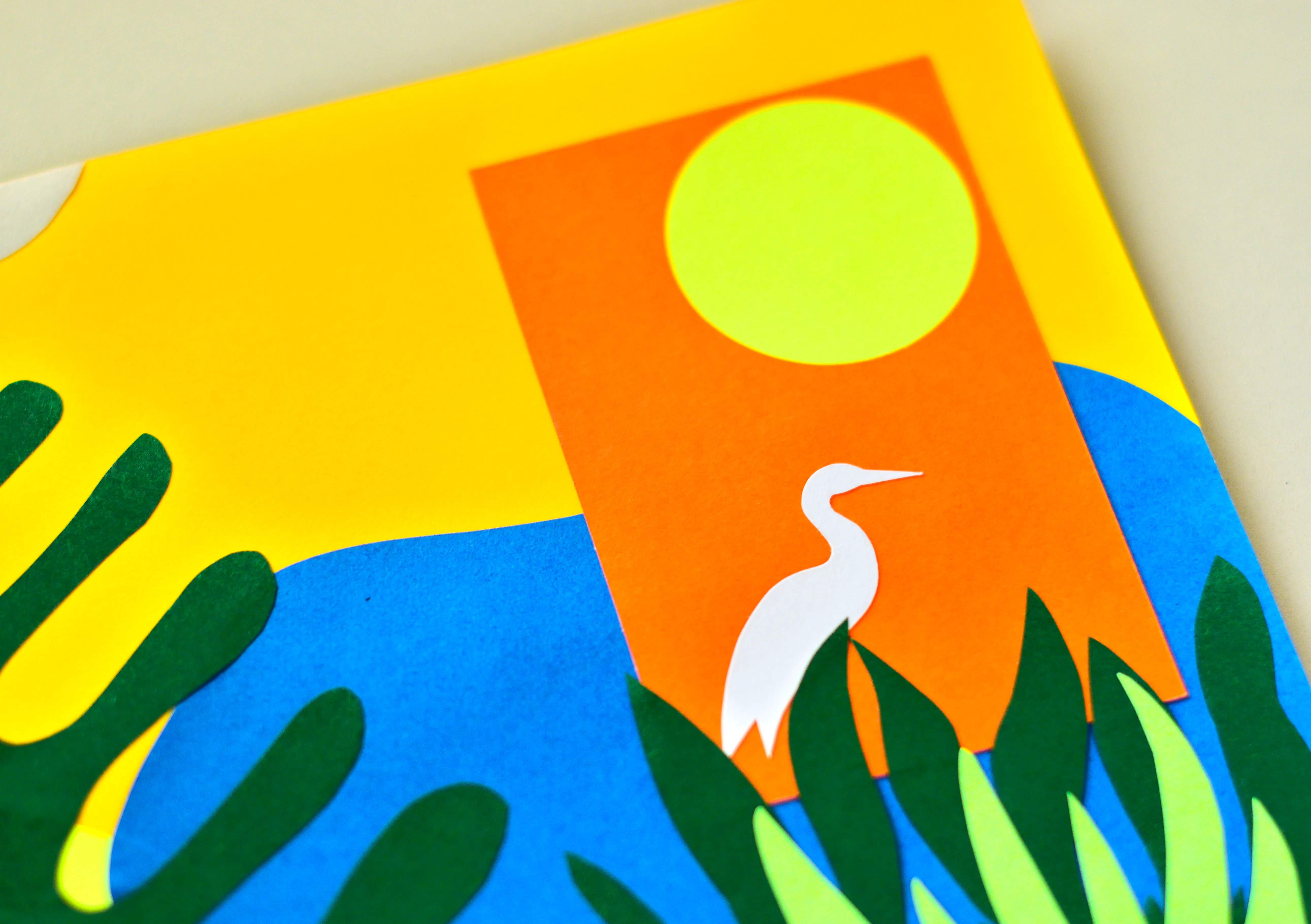 Tsuru i Tsuki – kolaż wycinankowy luźno inspirowany wycinankami Henriego Matisse’a (ang. cut-outs) oraz estetyką hanafudy, tradycyjnej japońskiej talii kart opartych na symbolice pór roku. Pojedyncze kształty wycięte z kolorowych papierów oddają charakter krajobrazu pełnego natury. Żurawie symbolizują ciszę i ulotną harmonię, niemal bezszelestnie przecinają niebo i cierpliwie stoją w płytkiej wodzie, obserwując otoczenie. Kompozycja jest minimalistyczna, uspokajająca, wręcz medytacyjna. Skłania do refleksji nad przemijaniem i równowagą, oddycha subtelnym rytmem pór roku.