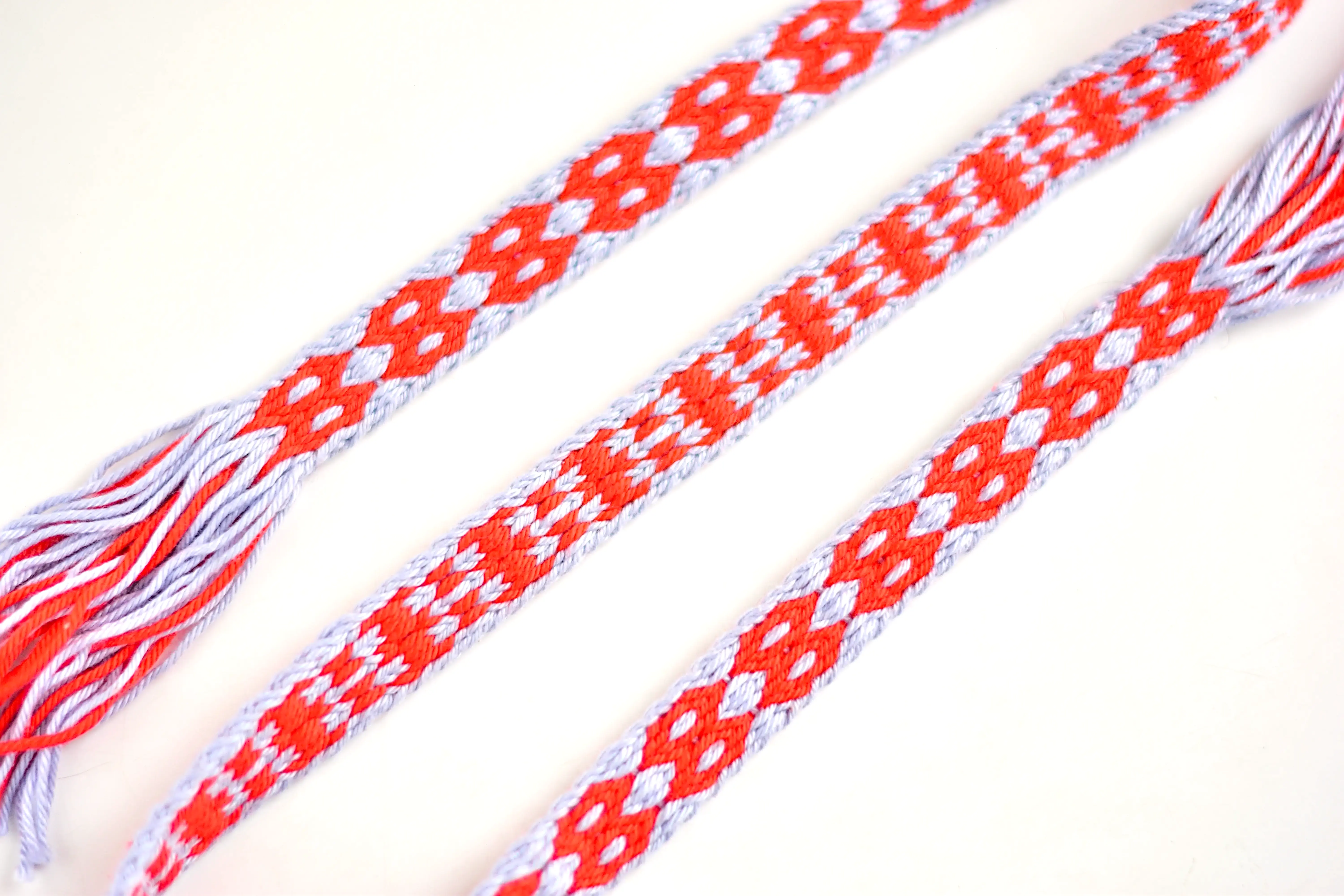 Czerwone romby – krajka bawełniana z prostym wzorem geometrycznym i kontrastowymi kolorami. Wzór jest jednostronny (z lewej strony jest bardziej abstrakcyjny). Krajka została utkana na ośmiu tabliczkach, w technice backstrap weaving.