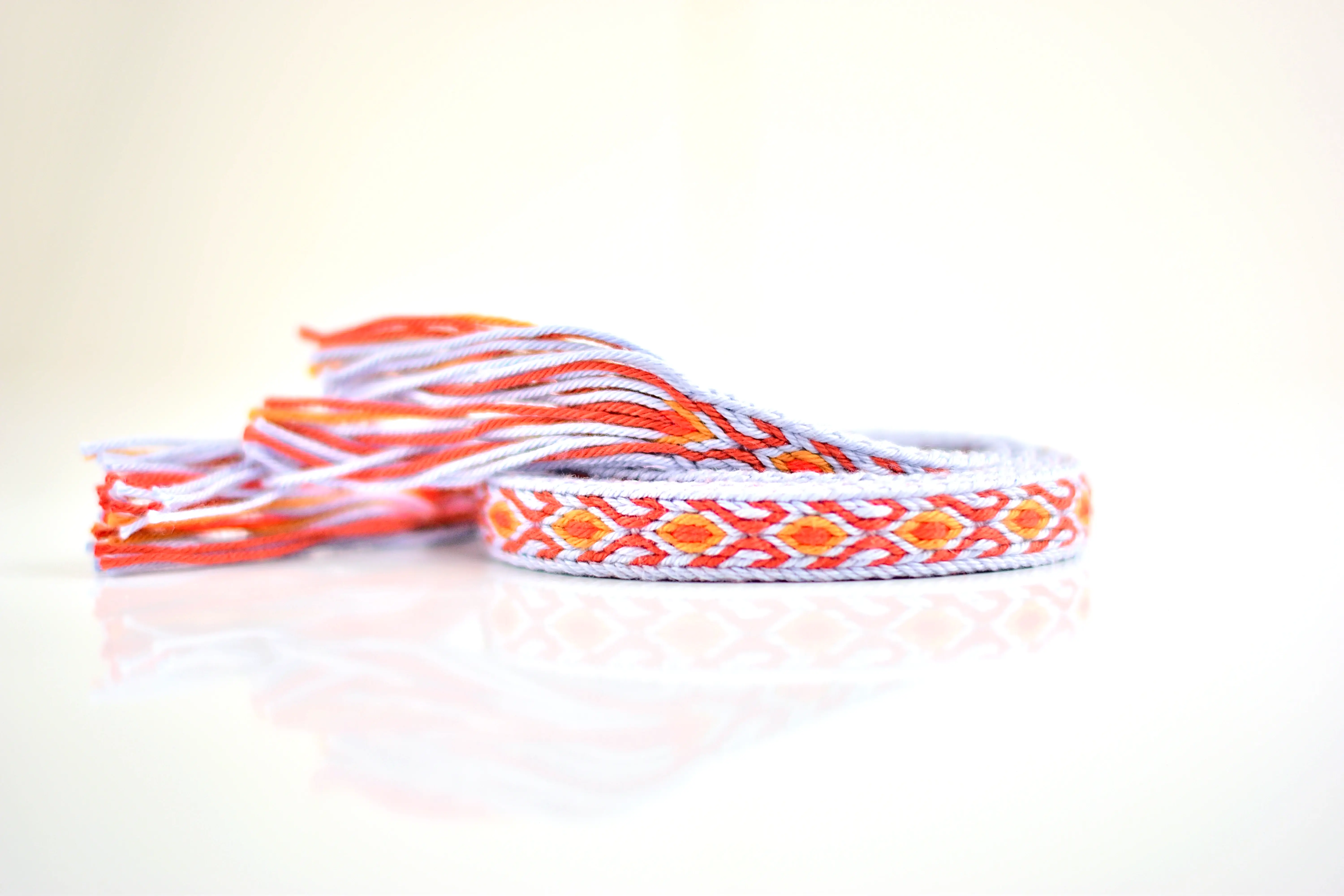 Płomień – krajka bawełniana z geometrycznym wzorem przywodzącym na myśl pochodnię z migoczącym płomieniem. Kolory został dobrane tak, by jeszcze bardziej podkreślić akcent ognia, który wyraźnie odcina się na delikatnym pastelowym tle. Z lewej strony wzór przybiera formę bardziej abstrakcyjną. Krajka została utkana na ośmiu tabliczkach, w technice backstrap weaving.