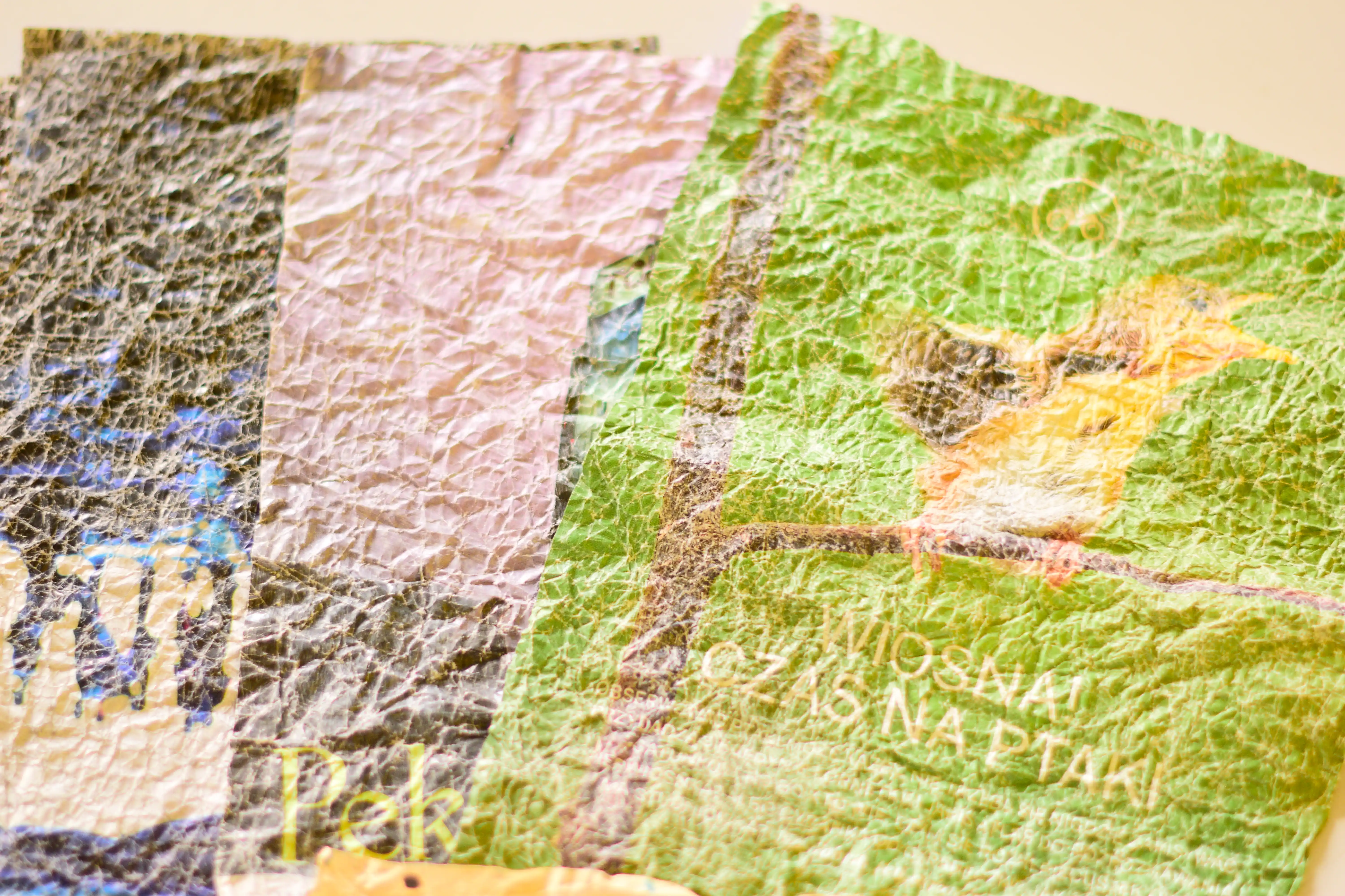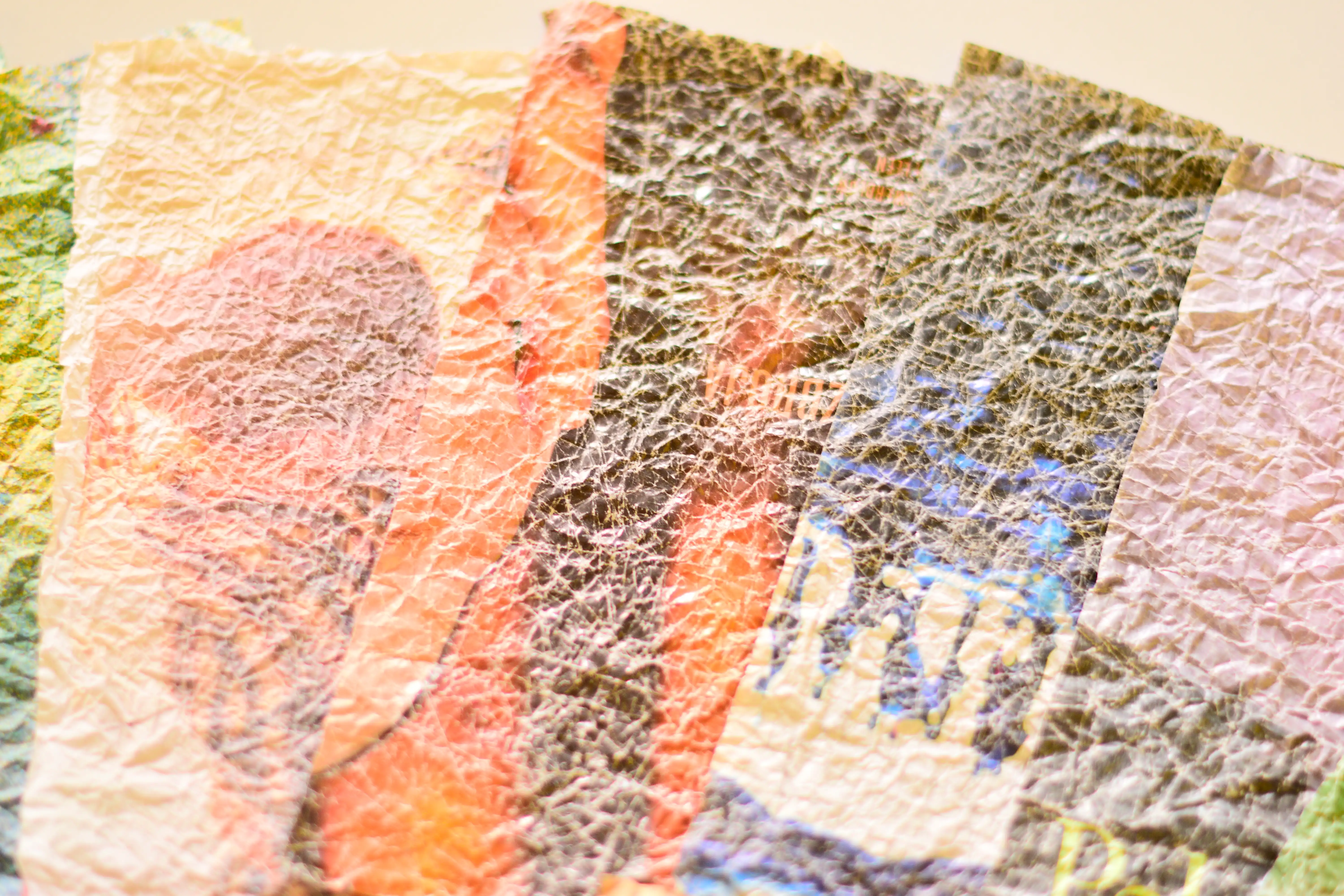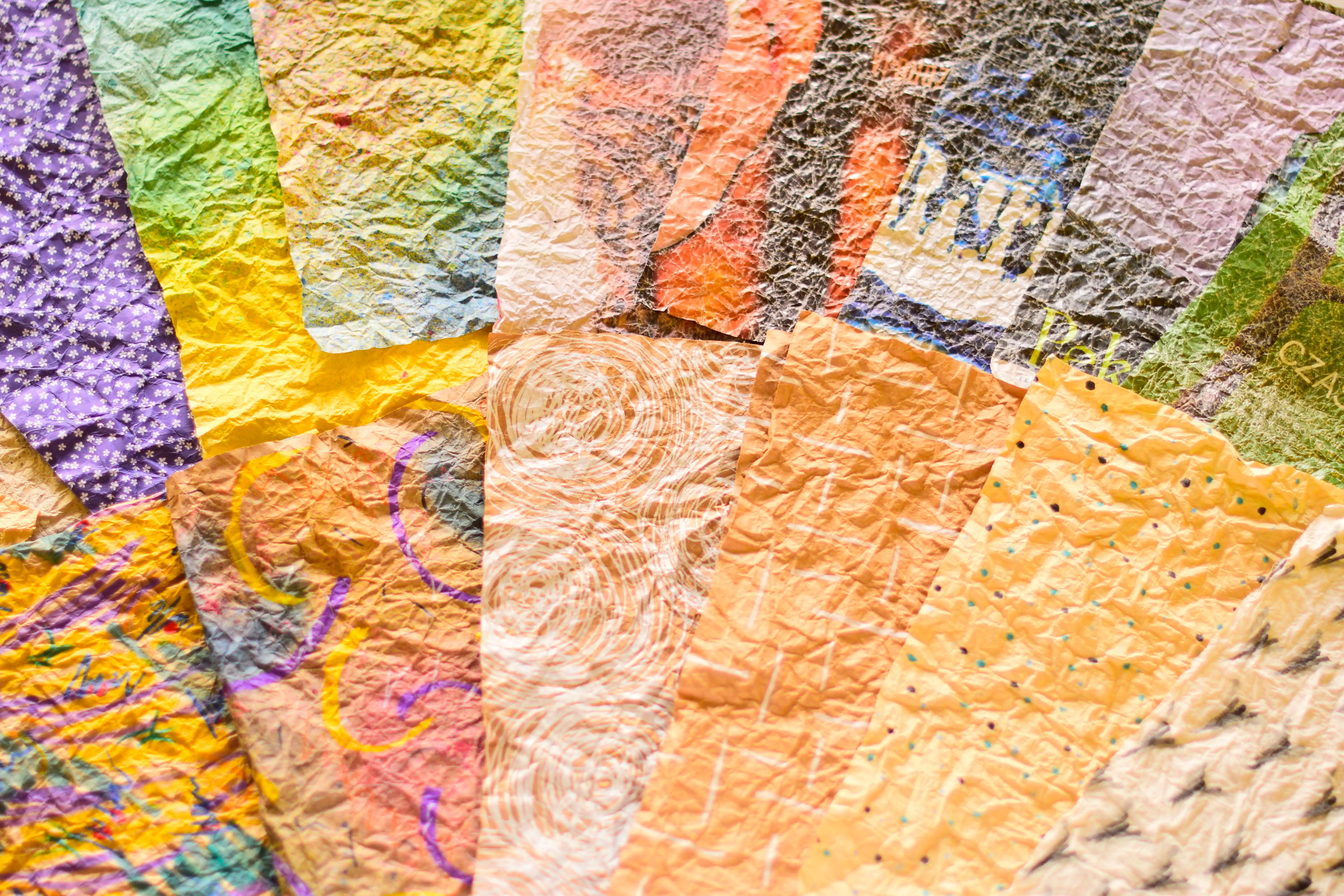 W galerii znalazła się selekcja moich papierów wykonanych w technice momi-gami. Wykorzystałam różnego rodzaju papiery: grubsze i cieńsze, ozdobne, czerpane bambusowe i morwowe, kartki z kolorowych magazynów oraz brązowy papier pakowy z toreb zakupowych. Niektóre papiery wykorzystałam w ich oryginalnej formie, inne pomalowałam najpierw farbami oraz markerami akrylowymi.
