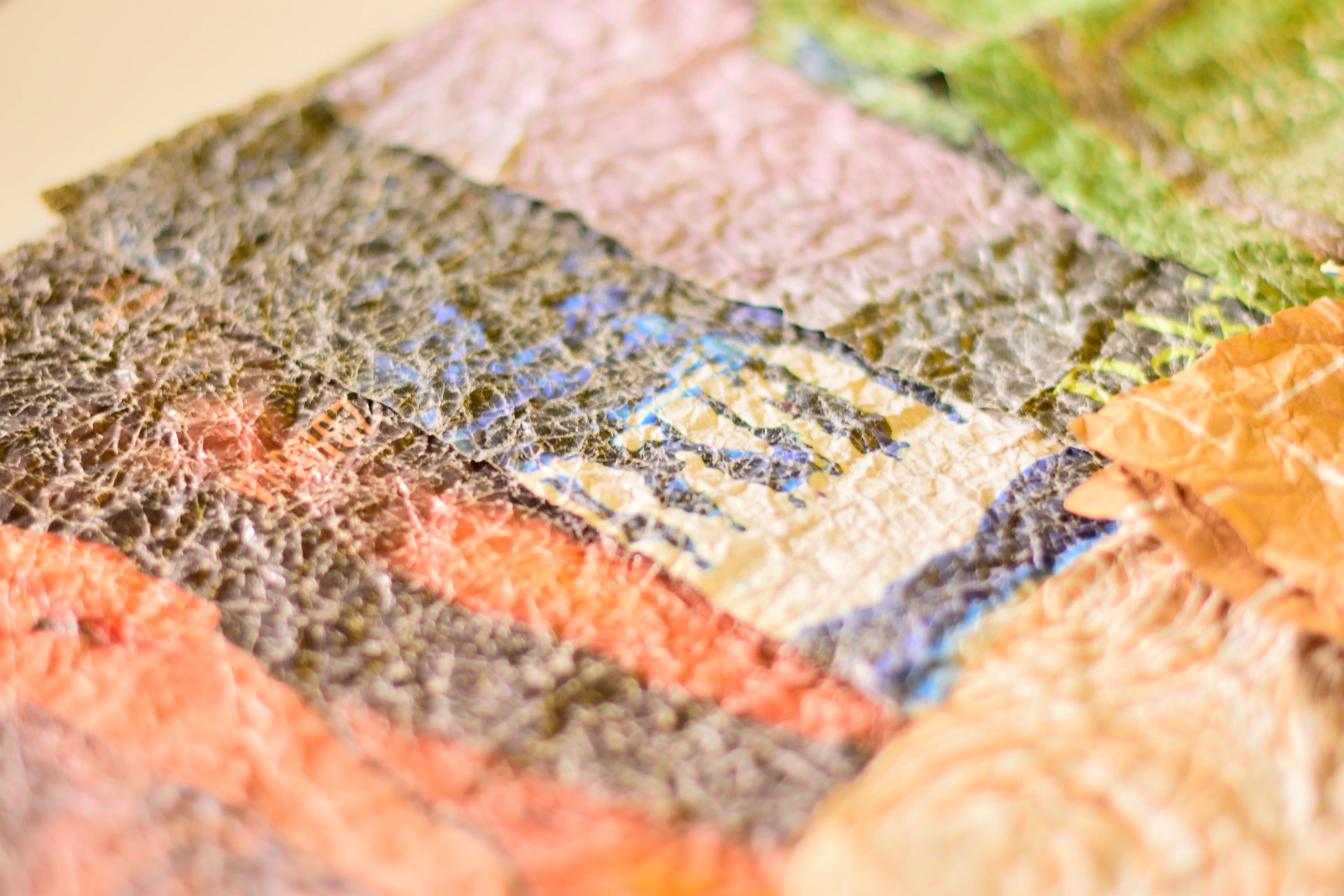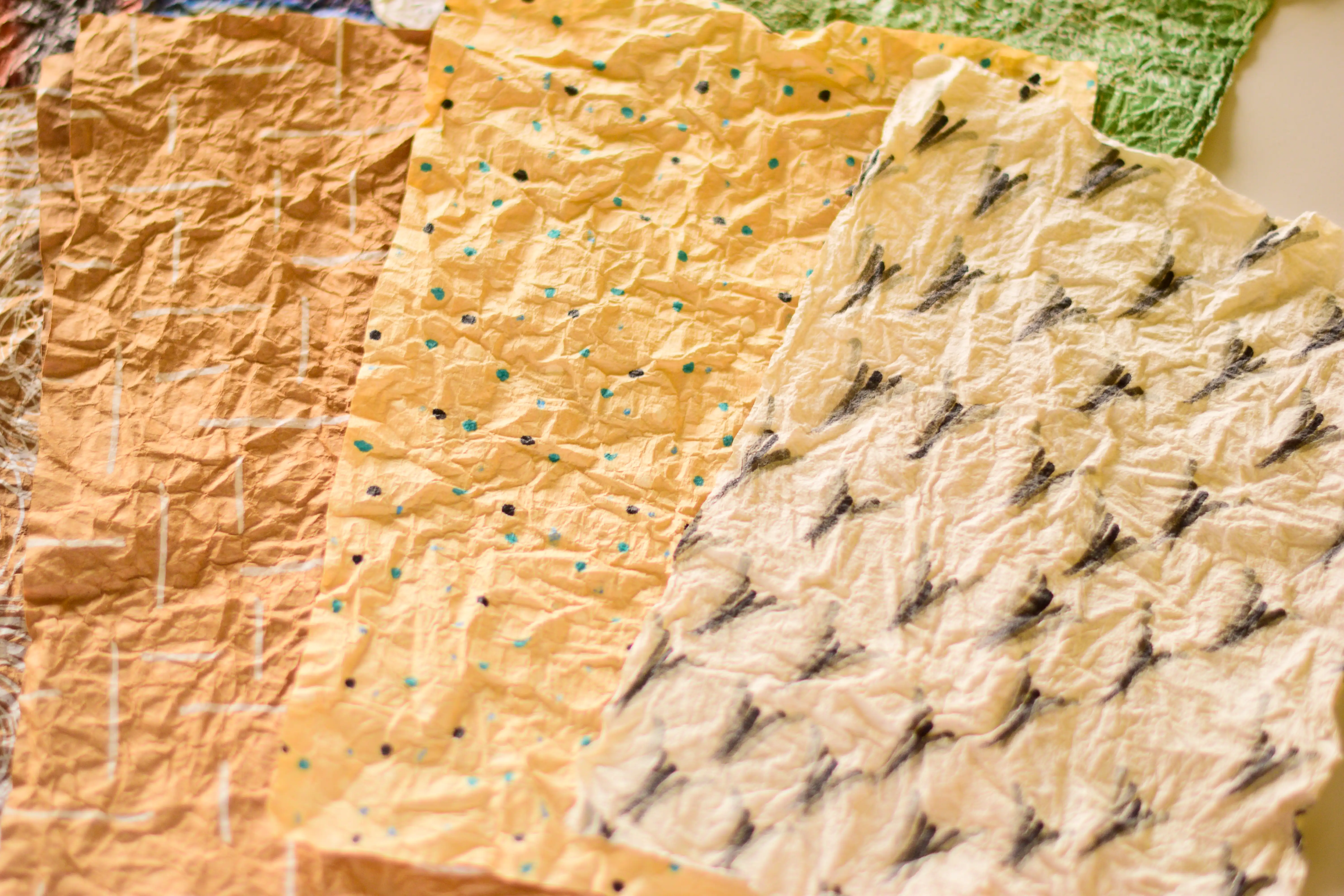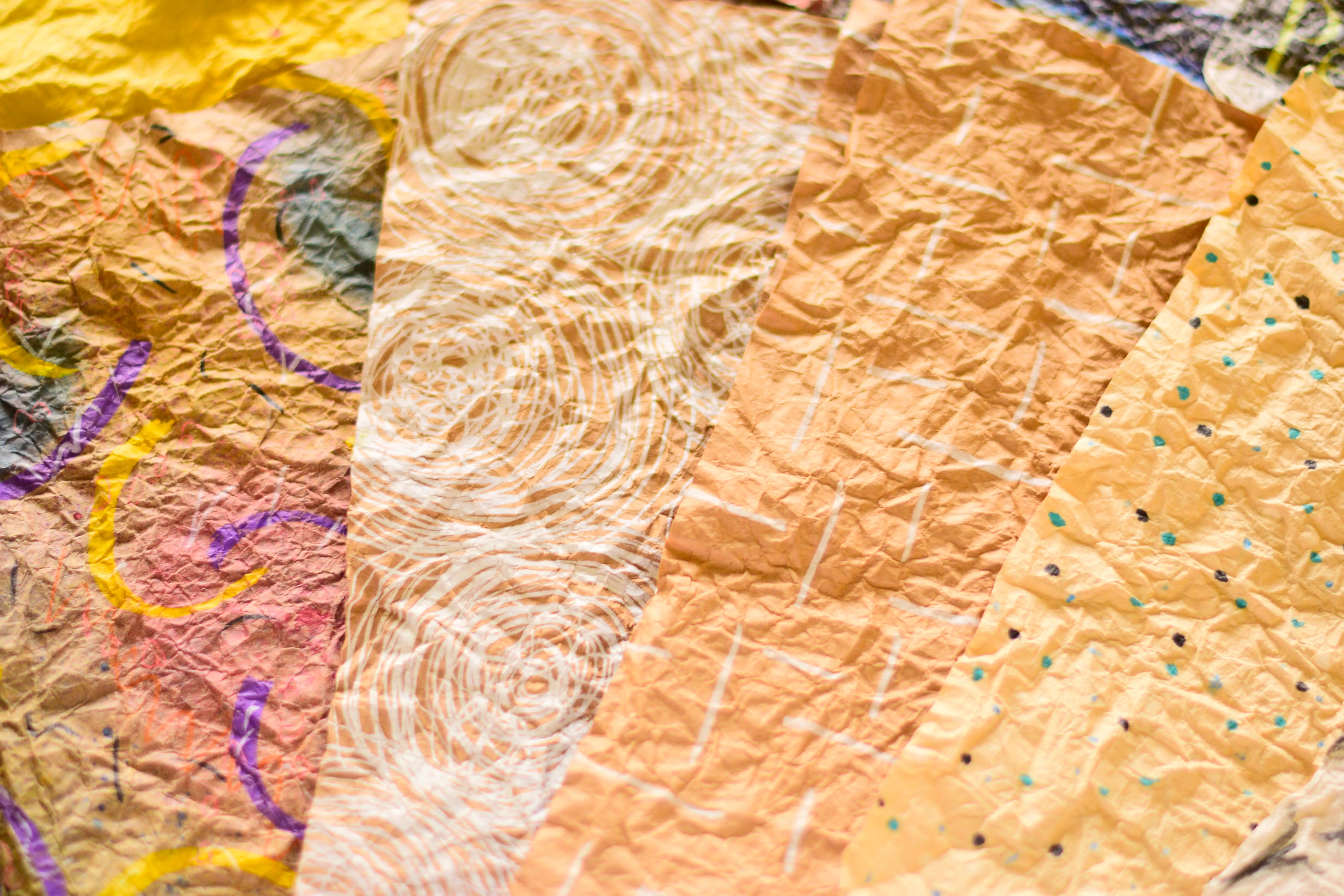 W galerii znalazła się selekcja moich papierów wykonanych w technice momi-gami. Wykorzystałam różnego rodzaju papiery: grubsze i cieńsze, ozdobne, czerpane bambusowe i morwowe, kartki z kolorowych magazynów oraz brązowy papier pakowy z toreb zakupowych. Niektóre papiery wykorzystałam w ich oryginalnej formie, inne pomalowałam najpierw farbami oraz markerami akrylowymi.