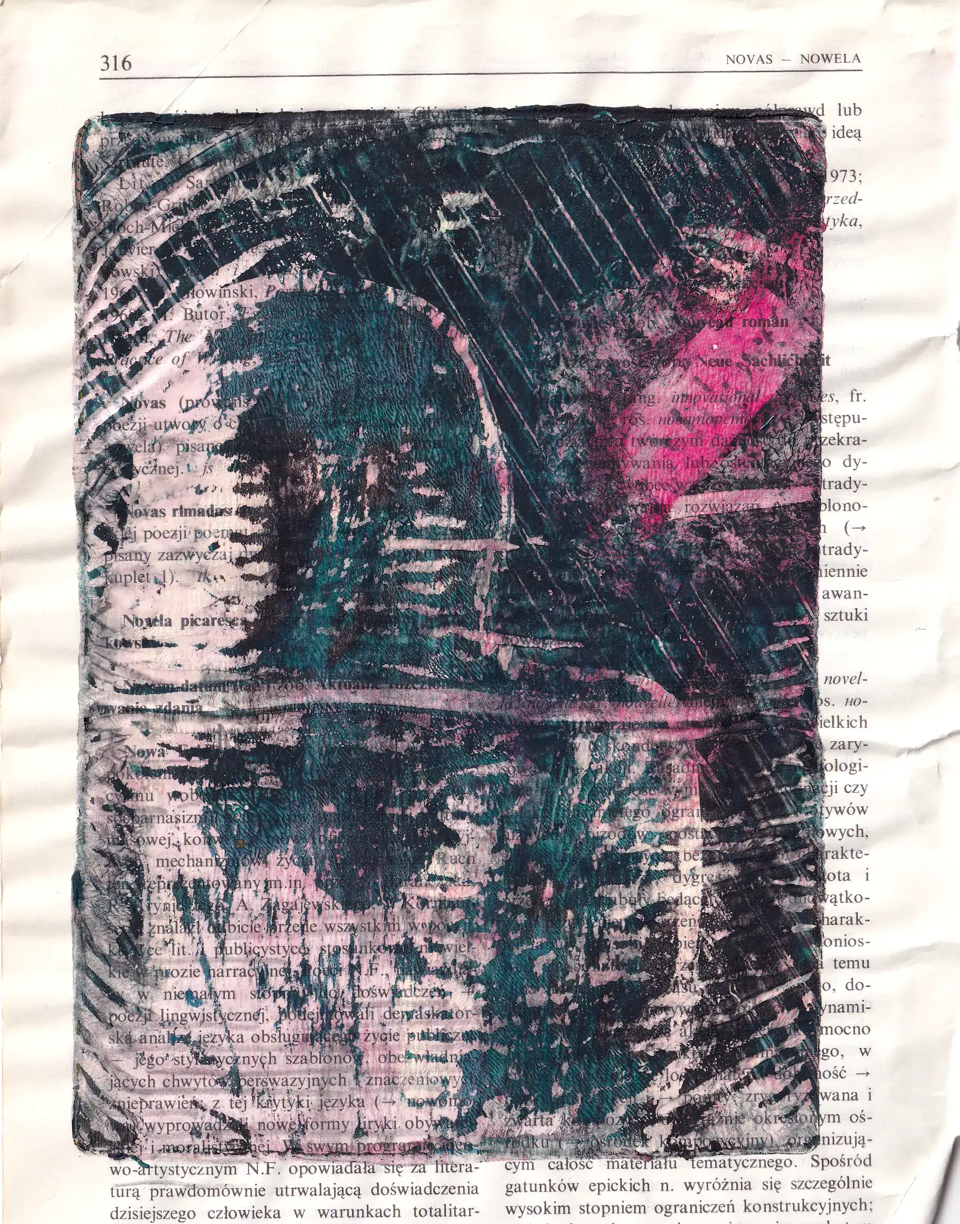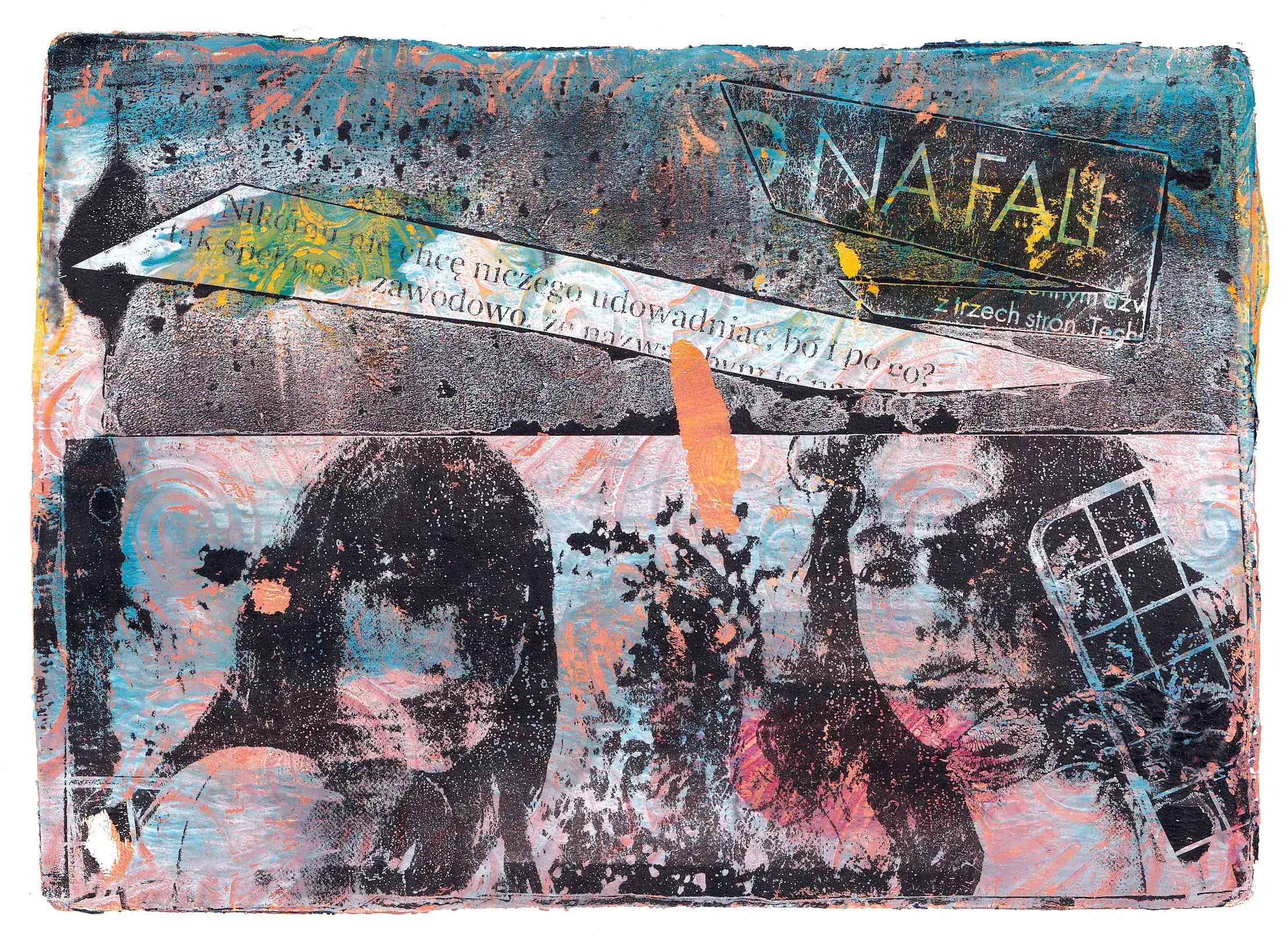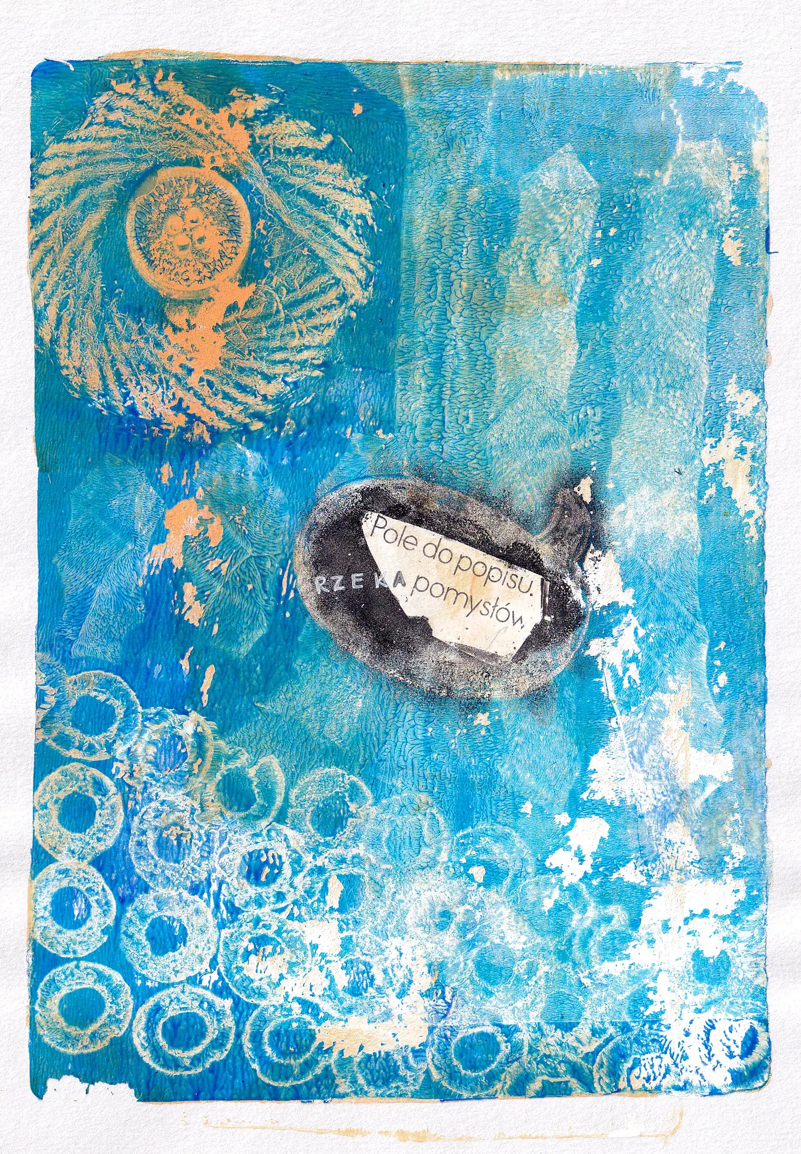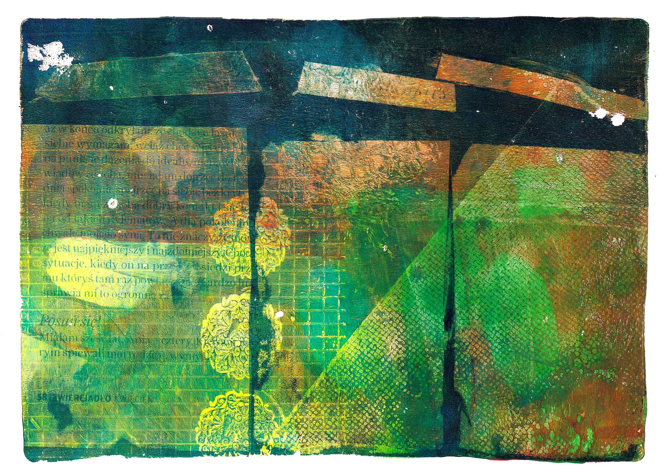 Technika: monotypia na płytce żelowej (akryl, tusz, cienkopis na papierze + transfer gazetowy)