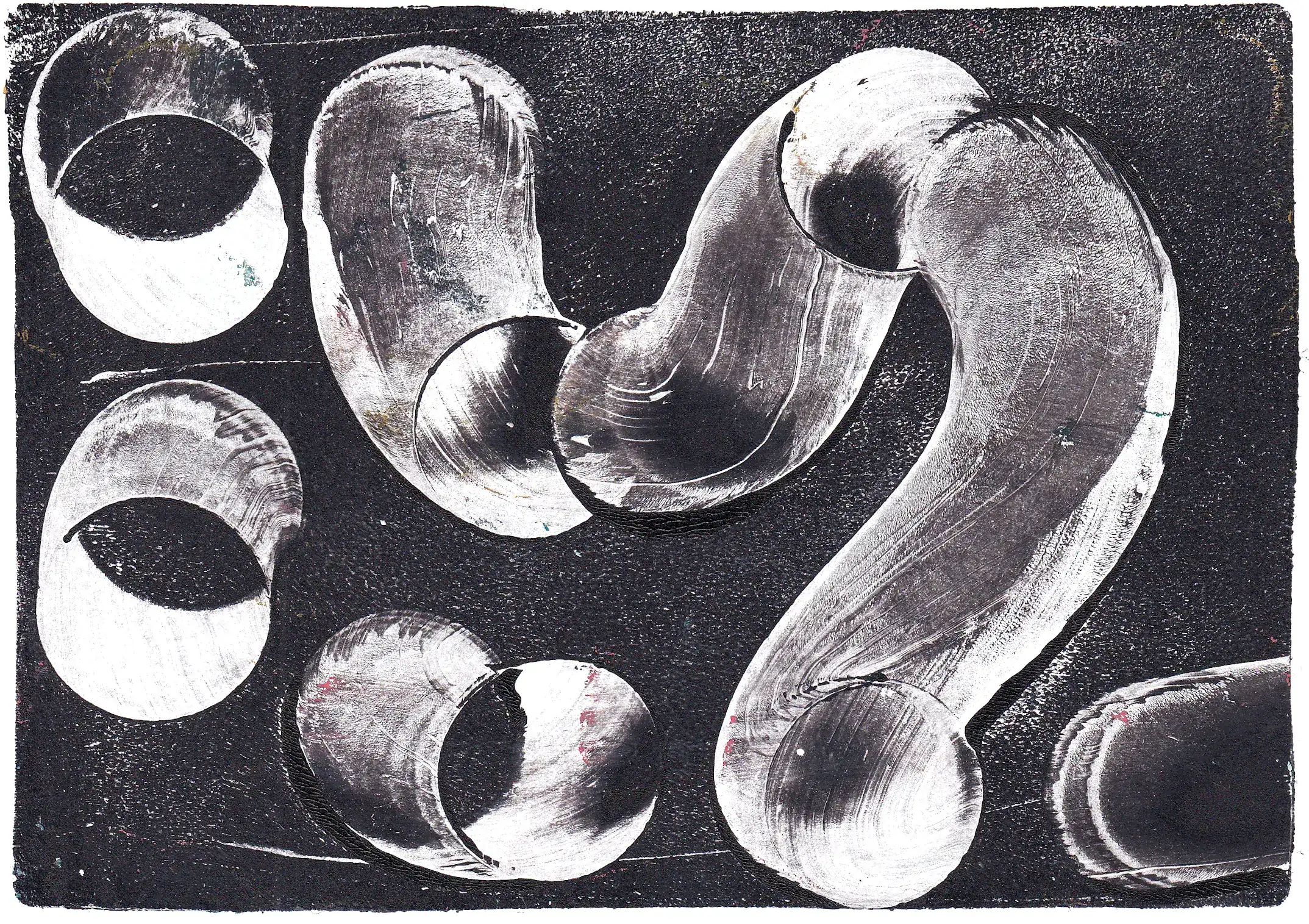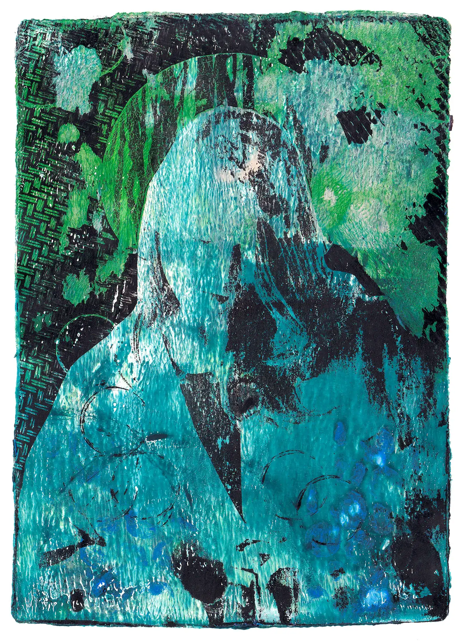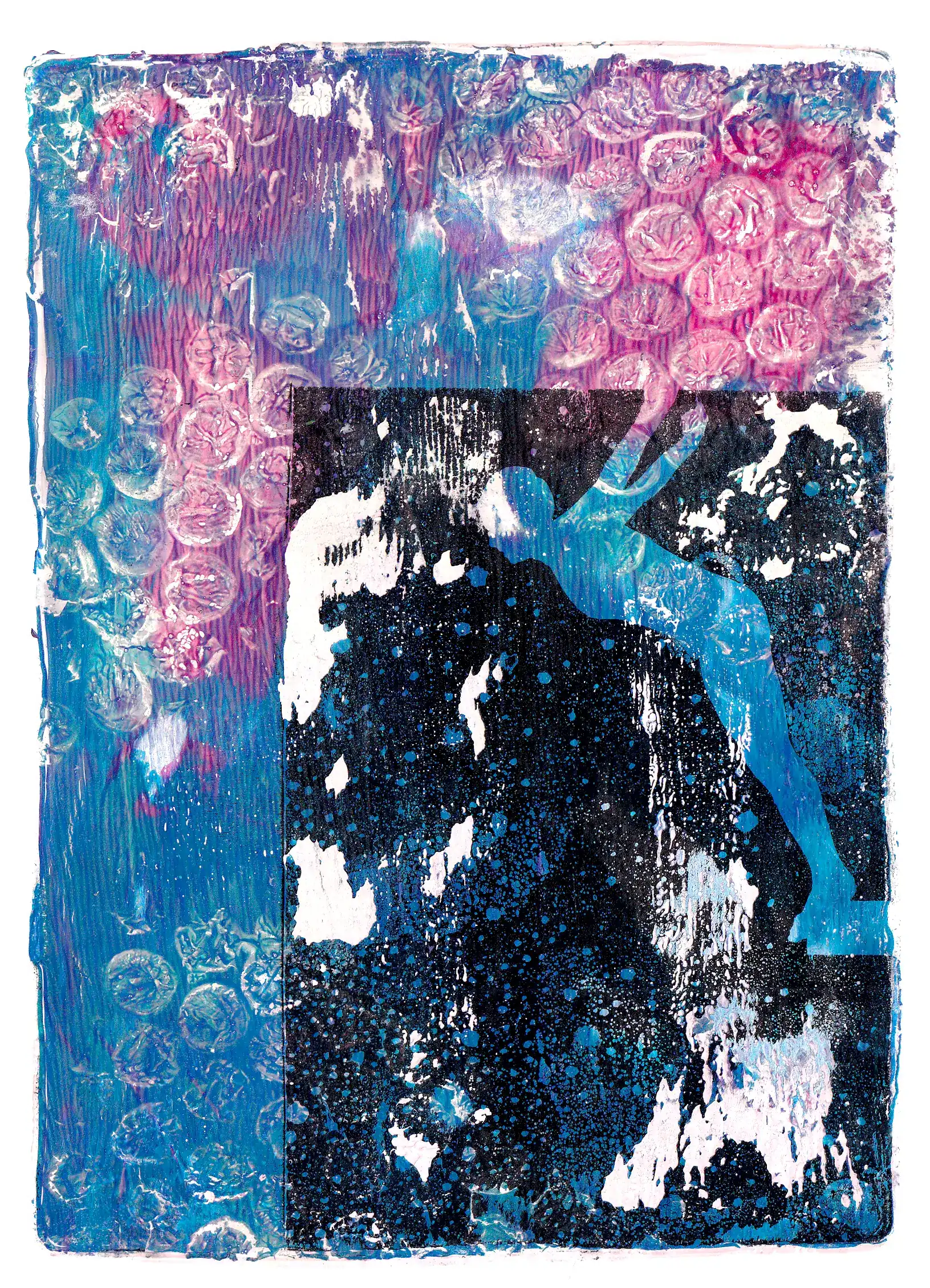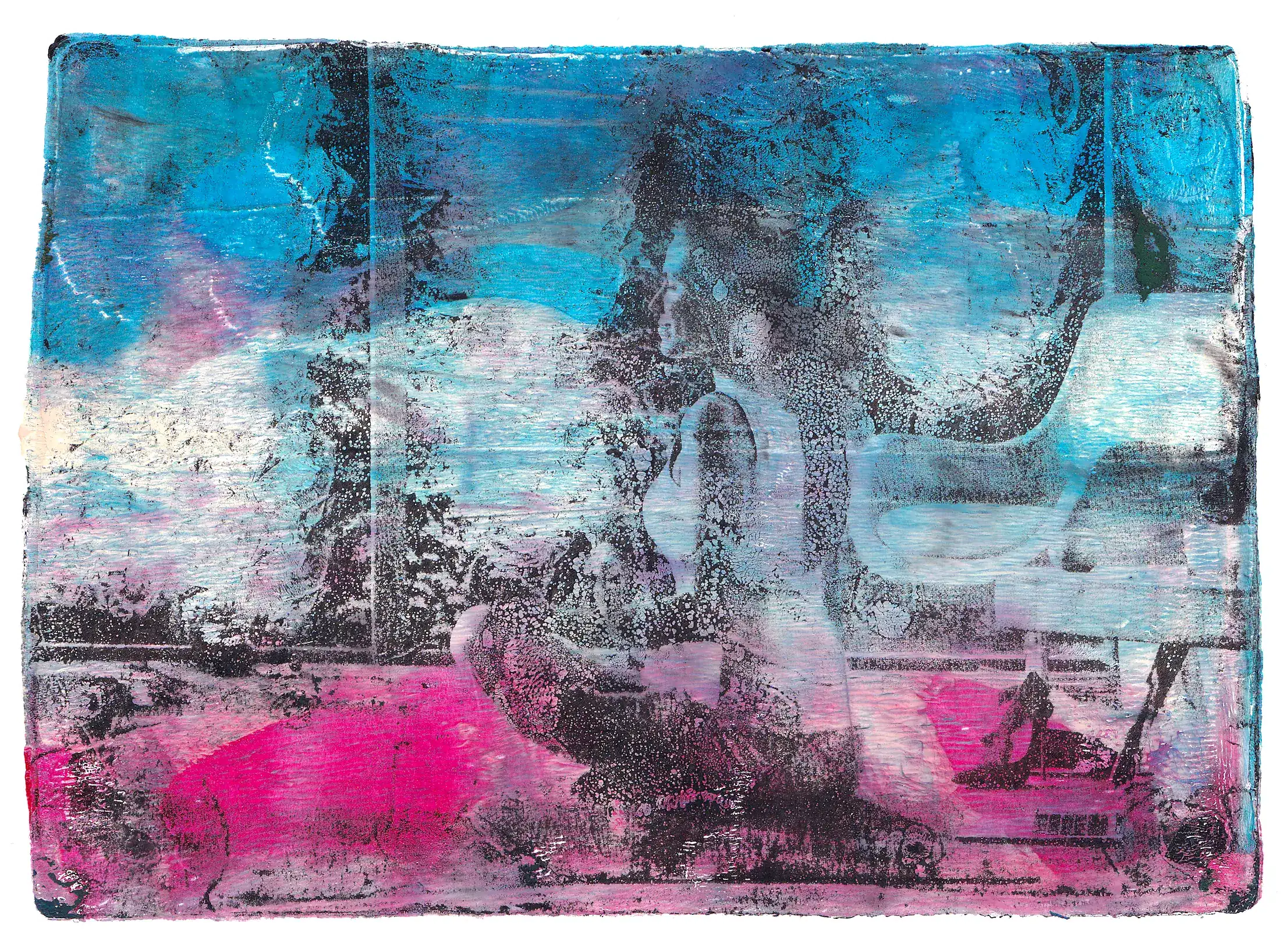 Technika: monotypia na płytce żelowej (akryl, tusz, cienkopis na papierze + transfer gazetowy)