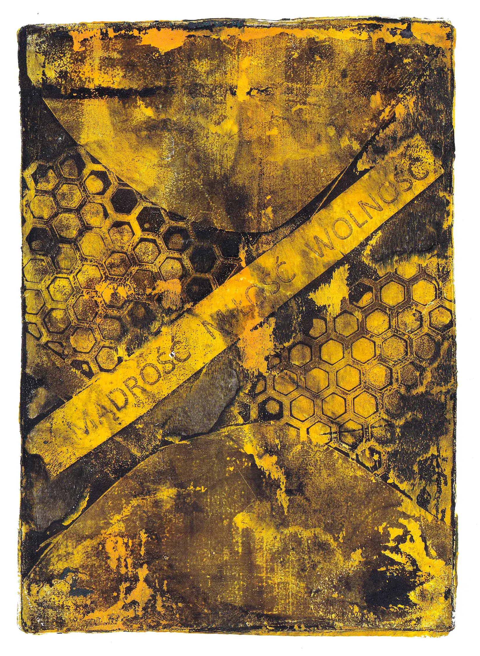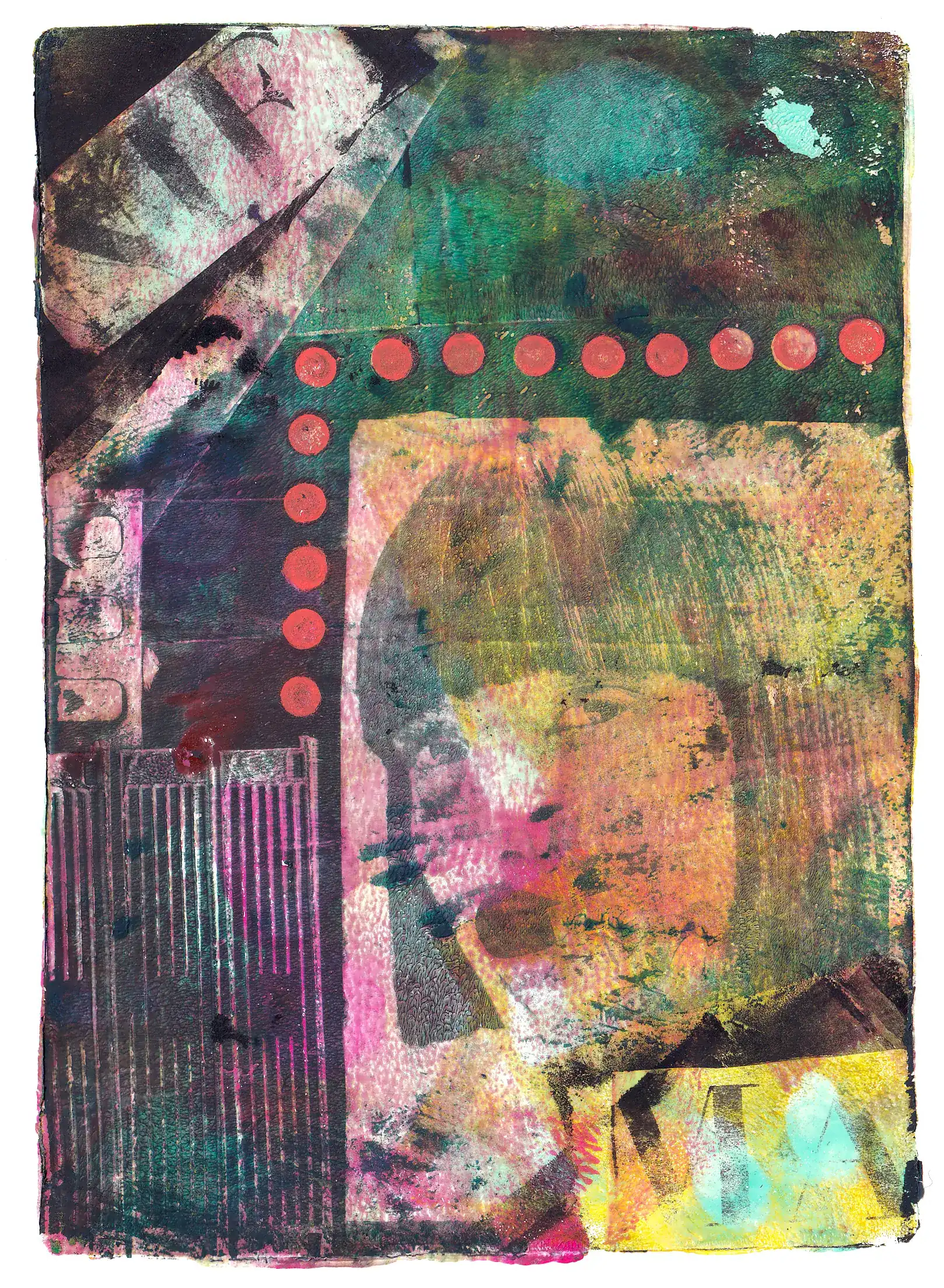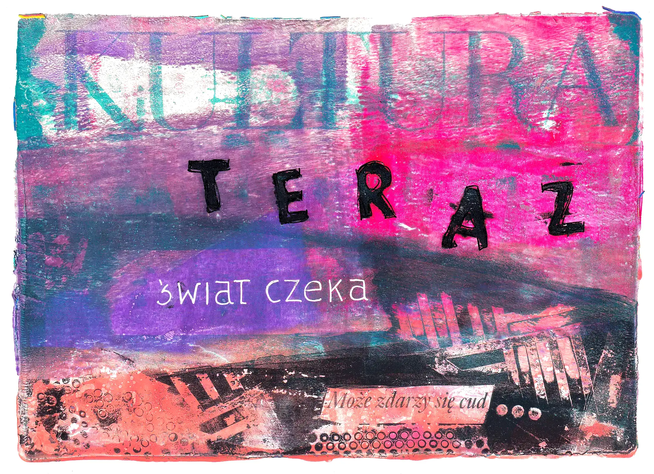 Monotypia z transferem gazetowym to odmiana monodruku na płytce żelowej, która jeszcze bardziej podkreśla swoistą kolażowość tej techniki. Zamiast opowiadać historie przez same kształty, kolory oraz interakcje między nimi, dokładamy element namacalnej, zrozumiałej formy. Wycinki z gazet – zarówno teksty, ilustracje, jak i zdjęcia – nie są fizycznie naklejane na papier, lecz odbijane warstwami na płytce, co w połączeniu z innymi elementami utworu buduje unikatową, kolażową kompozycję. Nie jest to najłatwiejsza odmiana monotypii na płytce żelowej na początek, ponieważ wymaga trochę wprawy, odpowiednich materiałów oraz wielu eksperymentów. Ale daje dużo satysfakcji i mocno poszerza możliwości wyrazu.