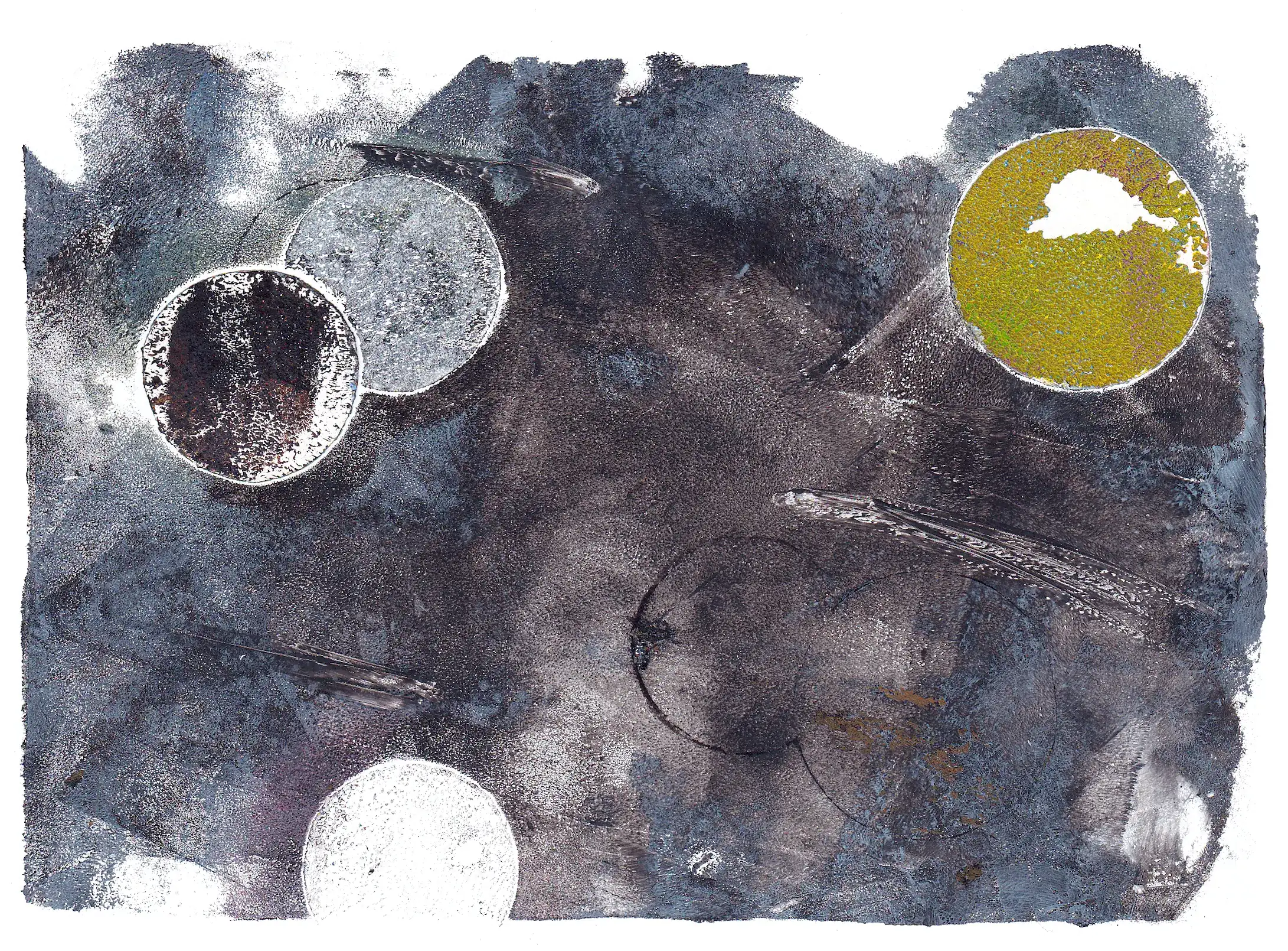 Przez Galaktykę I, II, III – seria trzech prac wykonanych ręcznie w technice monotypii. Symbolicznie eksploruje kosmos nad naszymi głowami oraz kosmos w naszych głowach.
