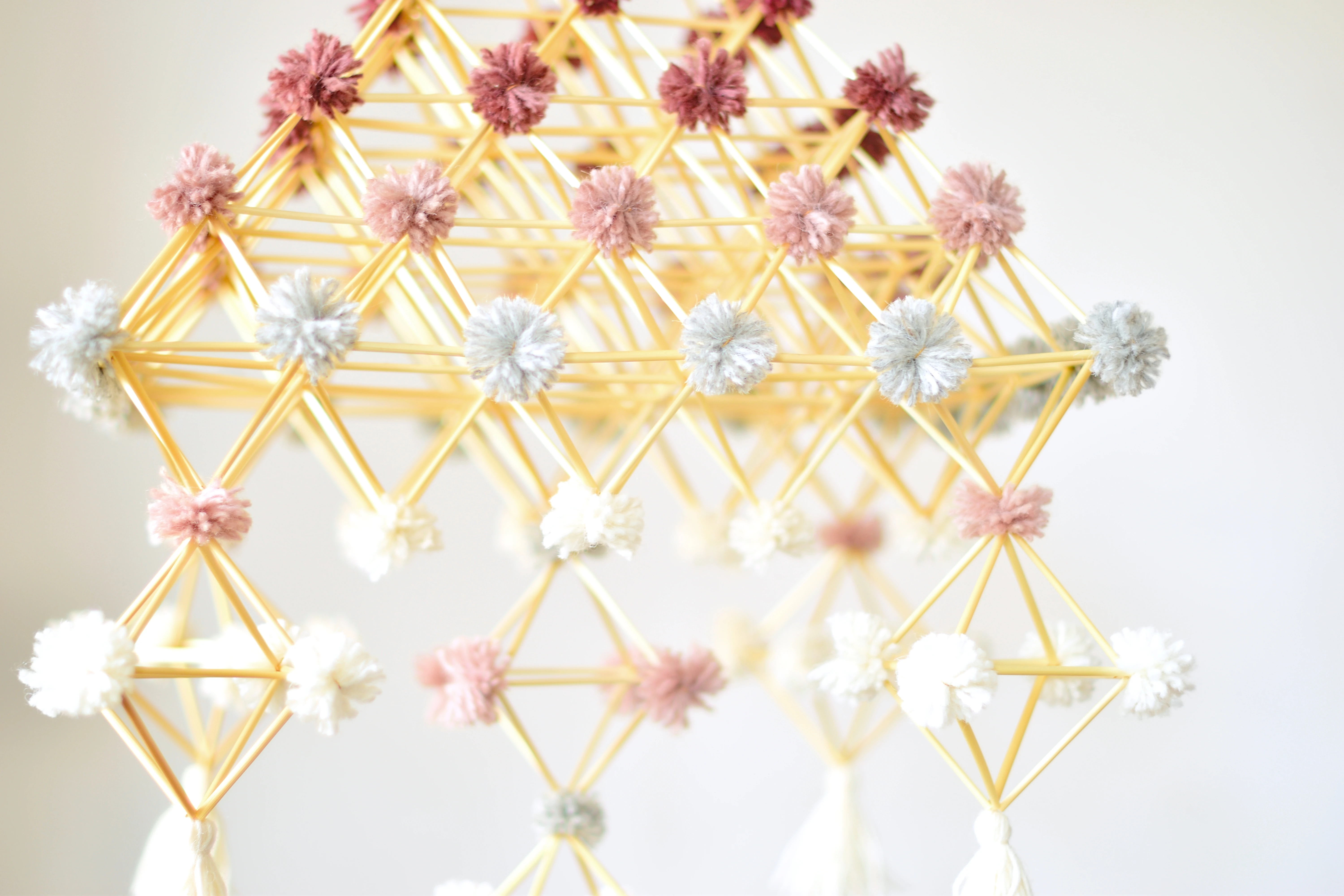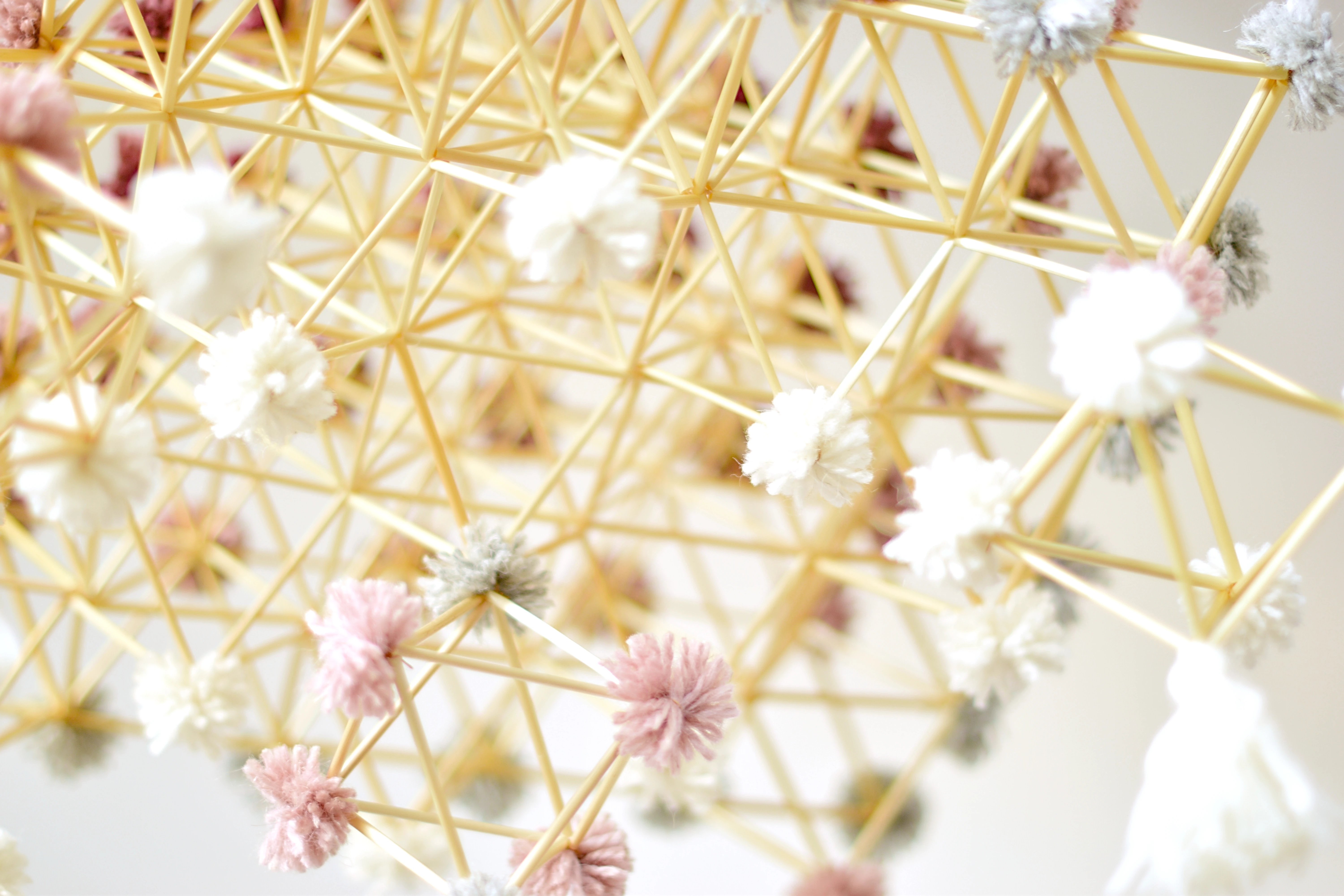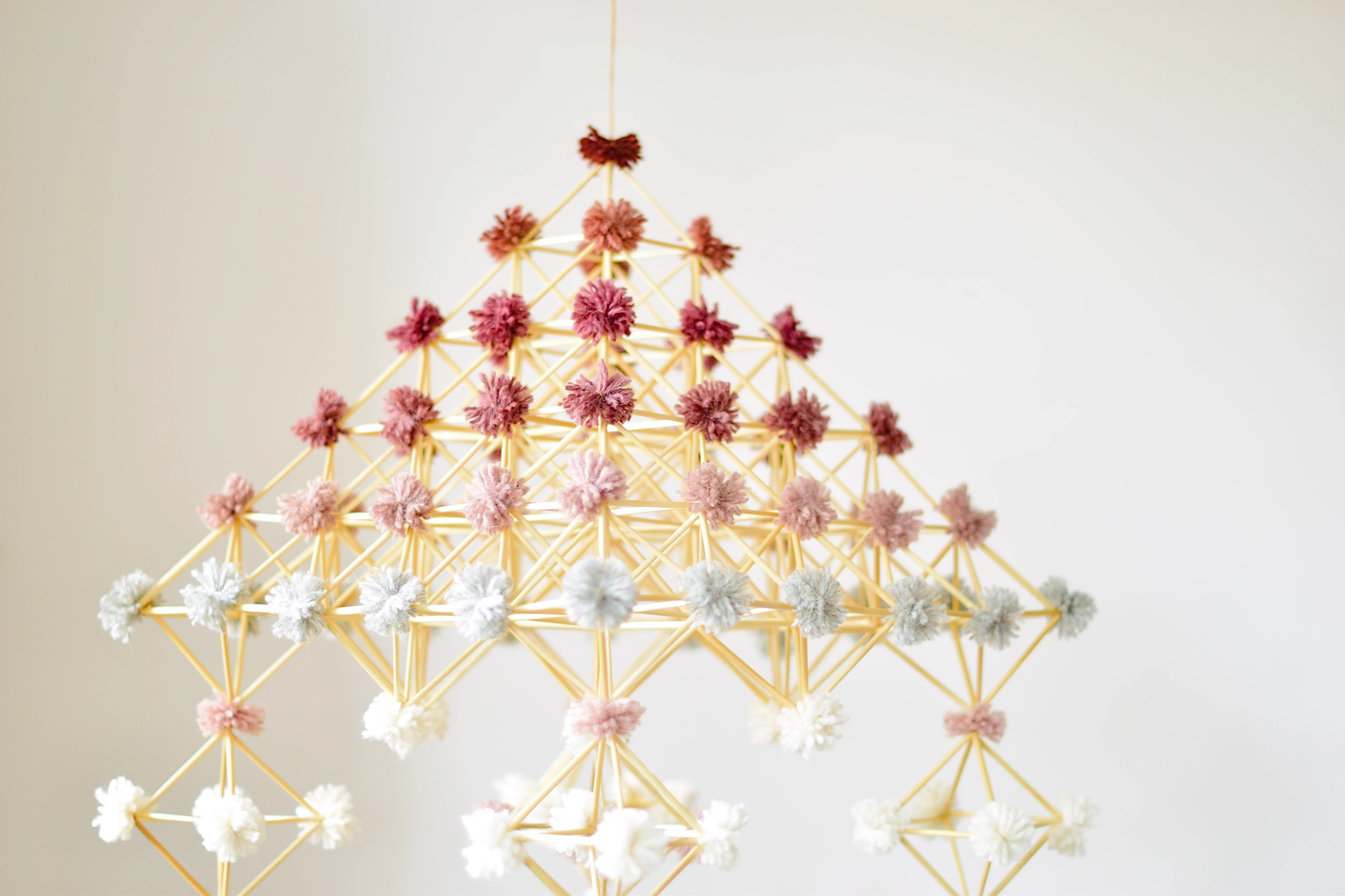 Pająk został wykonany ręcznie z kilkuset kawałków polskiej słomy żytniej, która została połączona w strukturę przypominającą piramidę. Słomianą konstrukcję zdobią pompony wykonane z polskiej wełny, którą zabarwiłam barwnikami pozyskanymi samodzielnie z korzenia marzanny barwierskiej (łac. Rubia tinctorum). Dzięki stworzeniu kilku różnych kąpieli barwierskich z tego samego surowca, uzyskałam paletę odmiennych tonów, od mocnego bordo aż do delikatnego różu. Dodatkowo w dolnej części pająka znalazły się pompony i chwosty wykonane z polskiej wełny w naturalnych kolorach runa owczego – popielatym i kremowym – idealnie harmonizujące energię czerwieni i różu z górnej części.