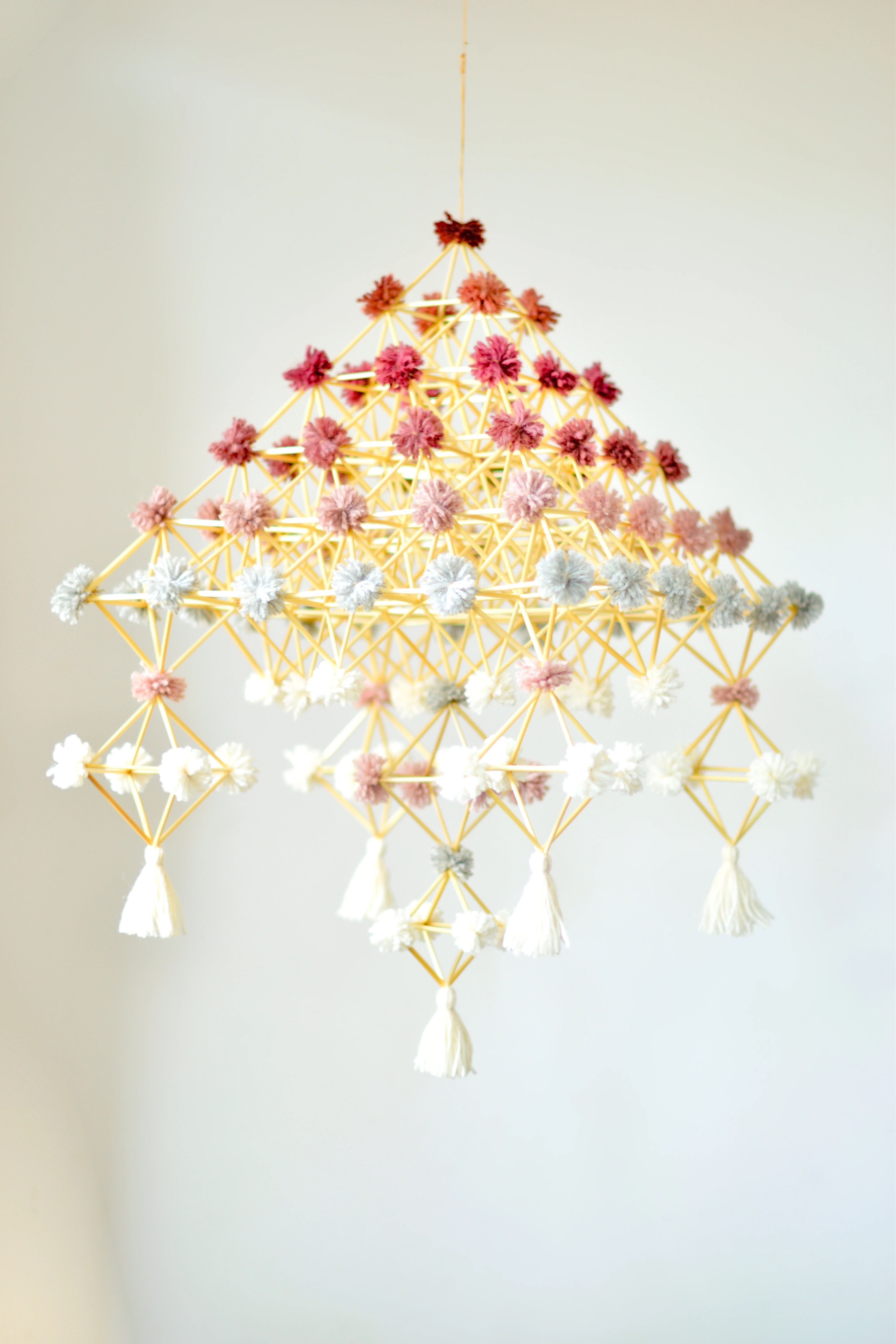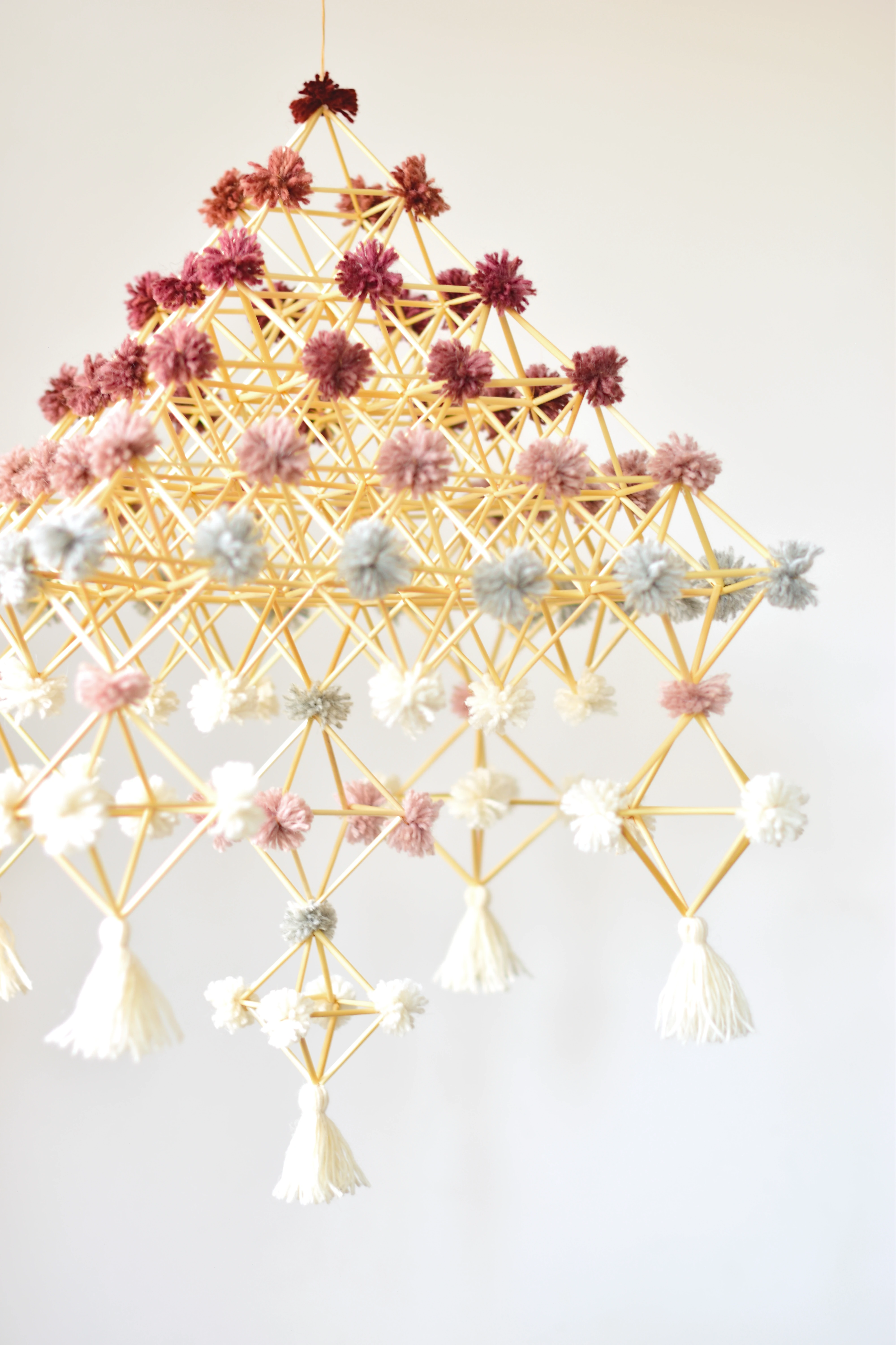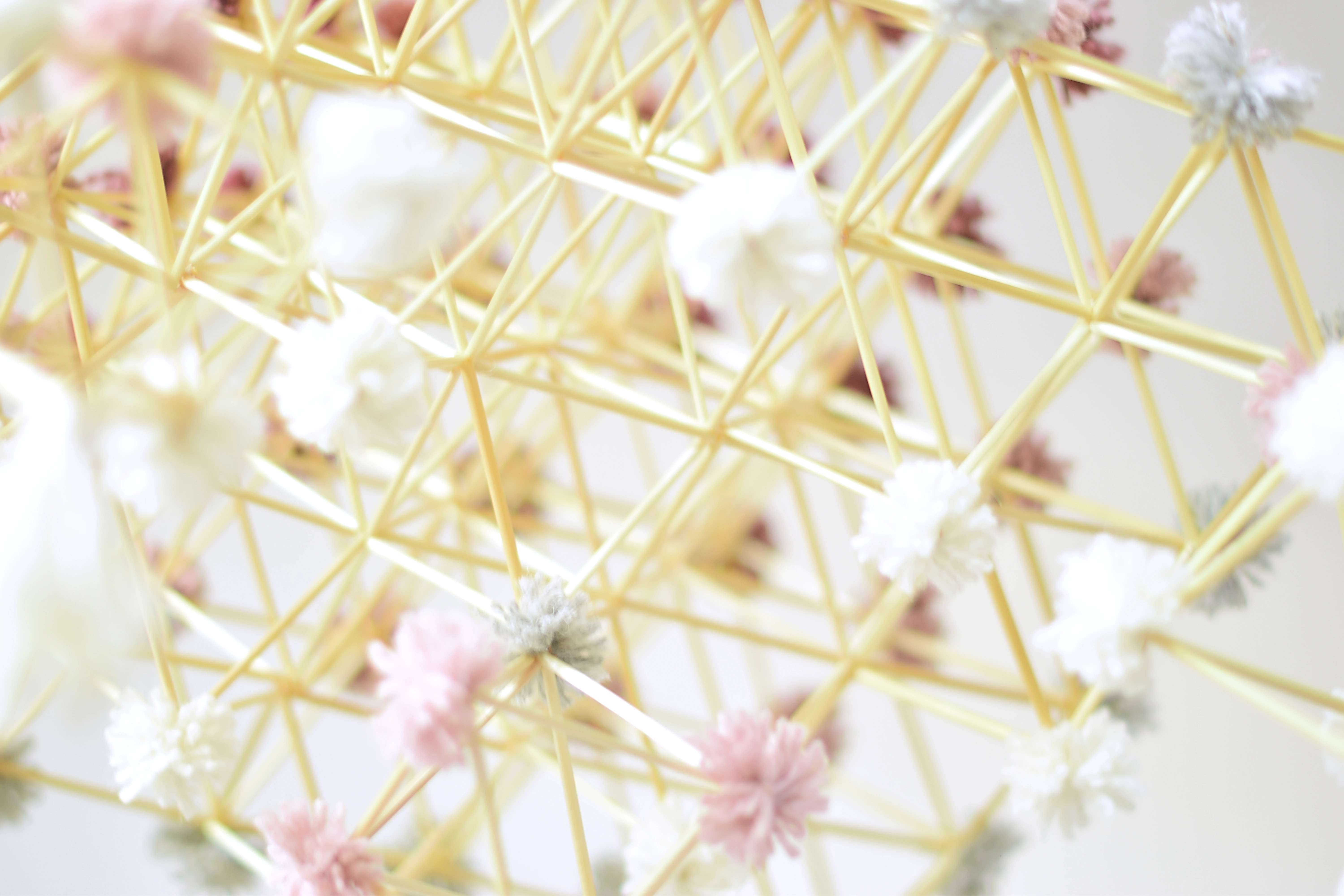 Pająk został wykonany ręcznie z kilkuset kawałków polskiej słomy żytniej, która została połączona w strukturę przypominającą piramidę. Słomianą konstrukcję zdobią pompony wykonane z polskiej wełny, którą zabarwiłam barwnikami pozyskanymi samodzielnie z korzenia marzanny barwierskiej (łac. Rubia tinctorum). Dzięki stworzeniu kilku różnych kąpieli barwierskich z tego samego surowca, uzyskałam paletę odmiennych tonów, od mocnego bordo aż do delikatnego różu. Dodatkowo w dolnej części pająka znalazły się pompony i chwosty wykonane z polskiej wełny w naturalnych kolorach runa owczego – popielatym i kremowym – idealnie harmonizujące energię czerwieni i różu z górnej części.