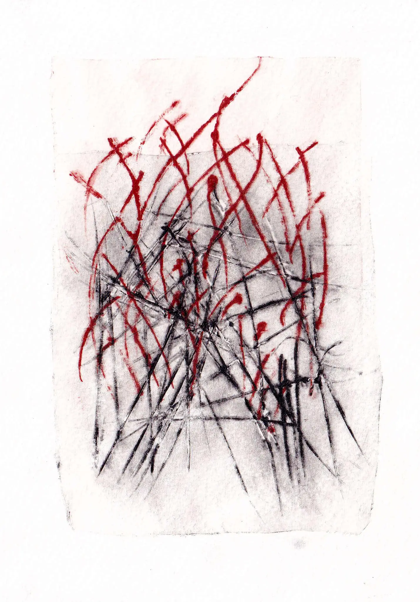 Ira – dyptyk wykonany ręcznie w technice eksperymentalnej suchej igły. Słowo ira w języku łacińskim oznacza wściekłość, gniew. Matryce powstały spontanicznie, w dużych emocjach, stając się swego rodzaju metodą oczyszczenia i poradzenia sobie na bieżąco z zaistniałą sytuacją. Pociągnięcia są tu szybkie i ostre. Ogień i blizny. Do wykonania matryc tego dyptyku zastosowałam cienką folię z recyklingu, ponieważ tylko taki materiał był w tamtym momencie i w tamtym miejscu dostępny. Matryce, choć bardzo kruche i nietrwałe, dały zadowalające efekty. Grafiki stały się idealnym odzwierciedleniem stanu emocjonalnego twórcy. Nawet same matryce, nieco zniszczone zaledwie po jednej odbitce, są integralną częścią tej opowieści.