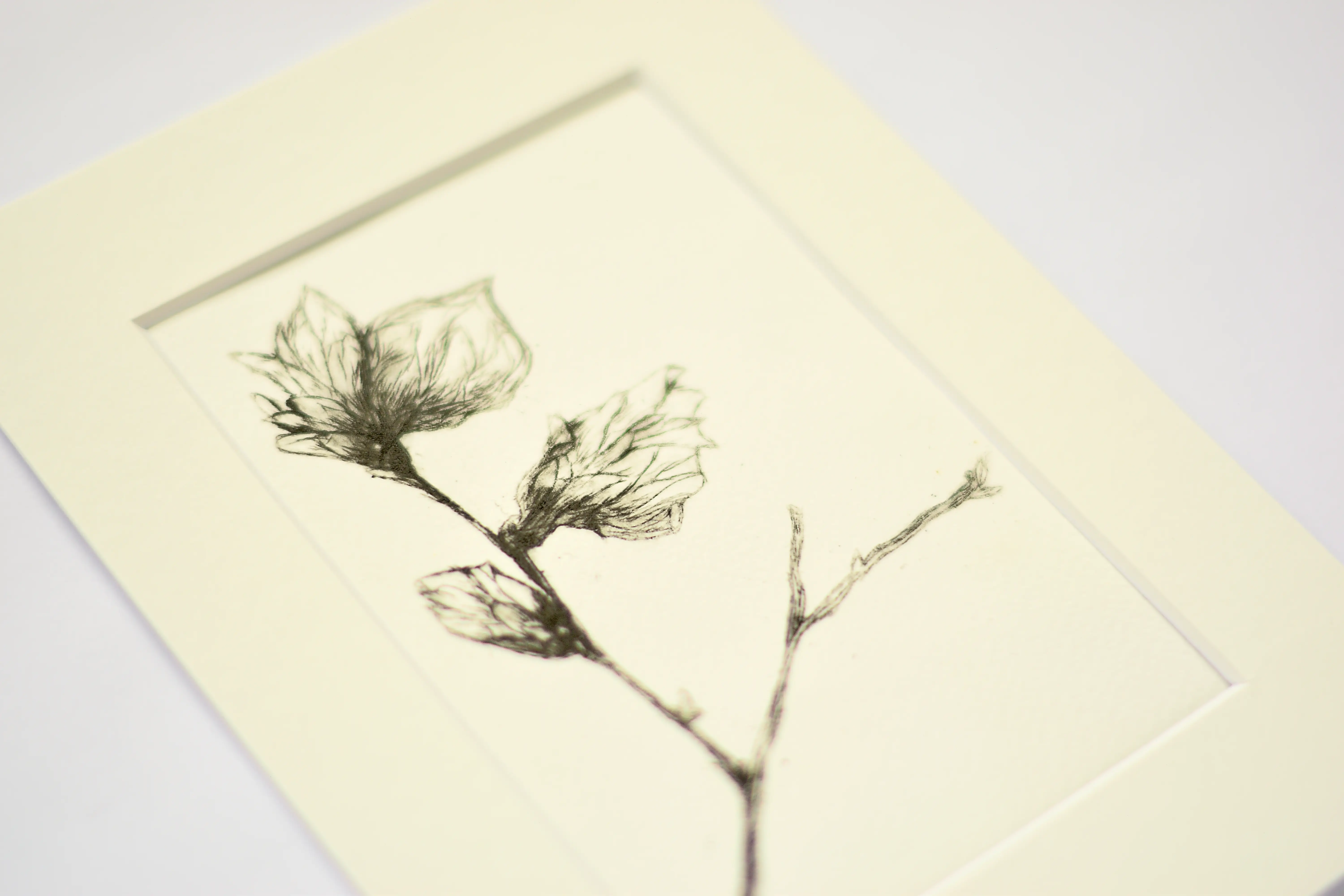 Magnolia – grafika wykonana ręcznie w technice suchej igły. Powstała na podstawie rysunku ołówkiem z natury. Miękka linia odbitki, charakterystyczna dla suchorytów, subtelnie podkreśla urok skąpanych w słońcu, ulotnych kwiatów magnolii.