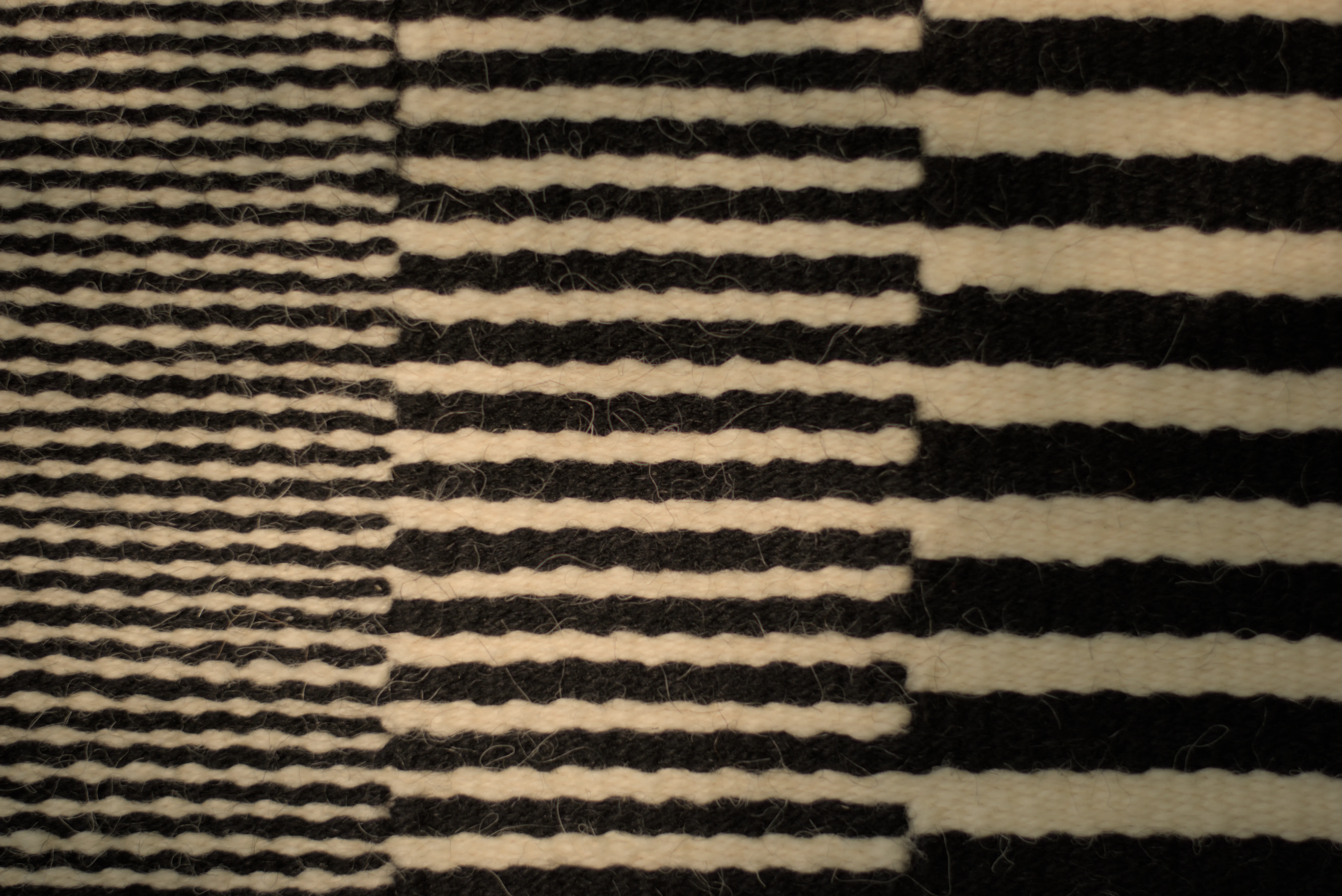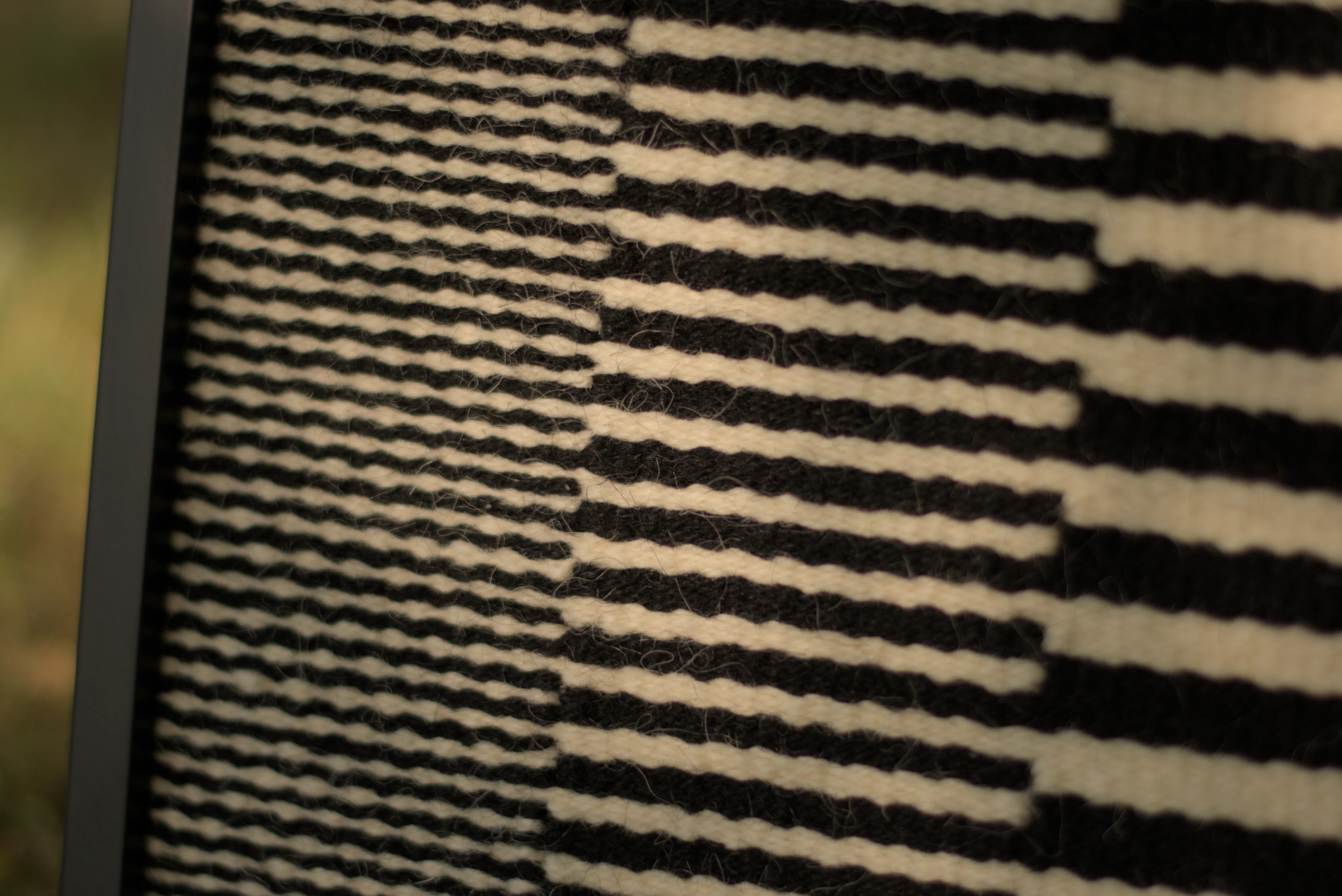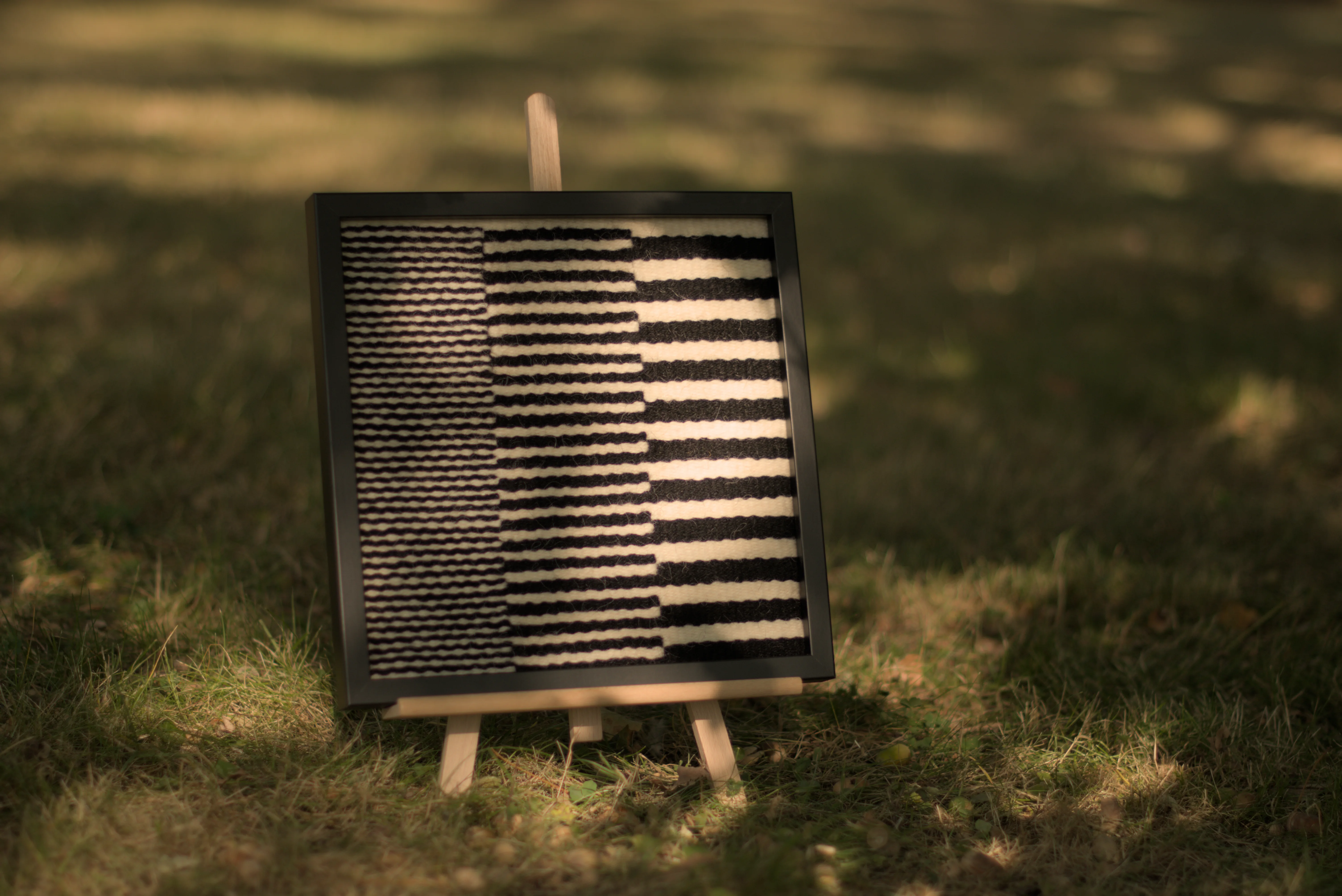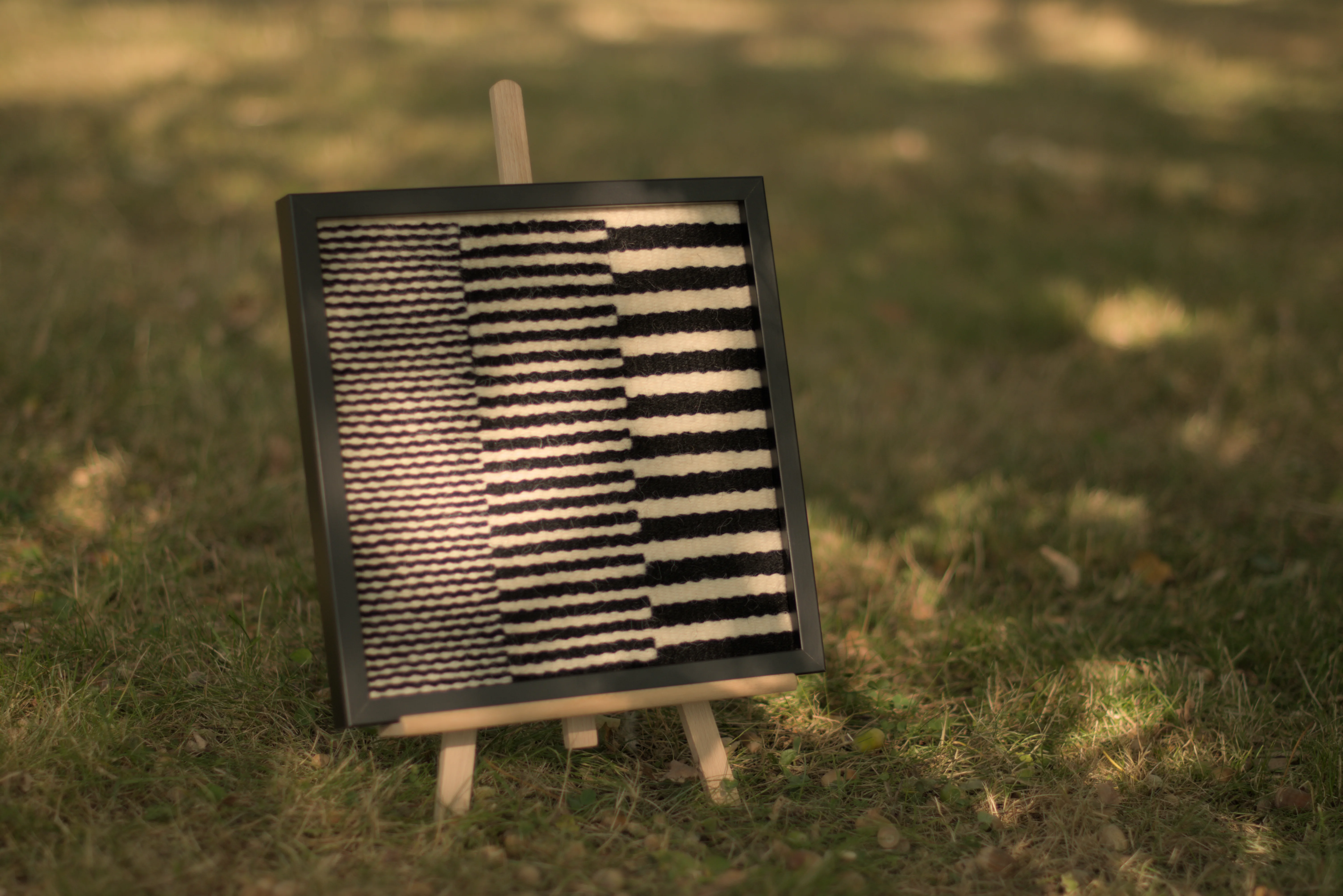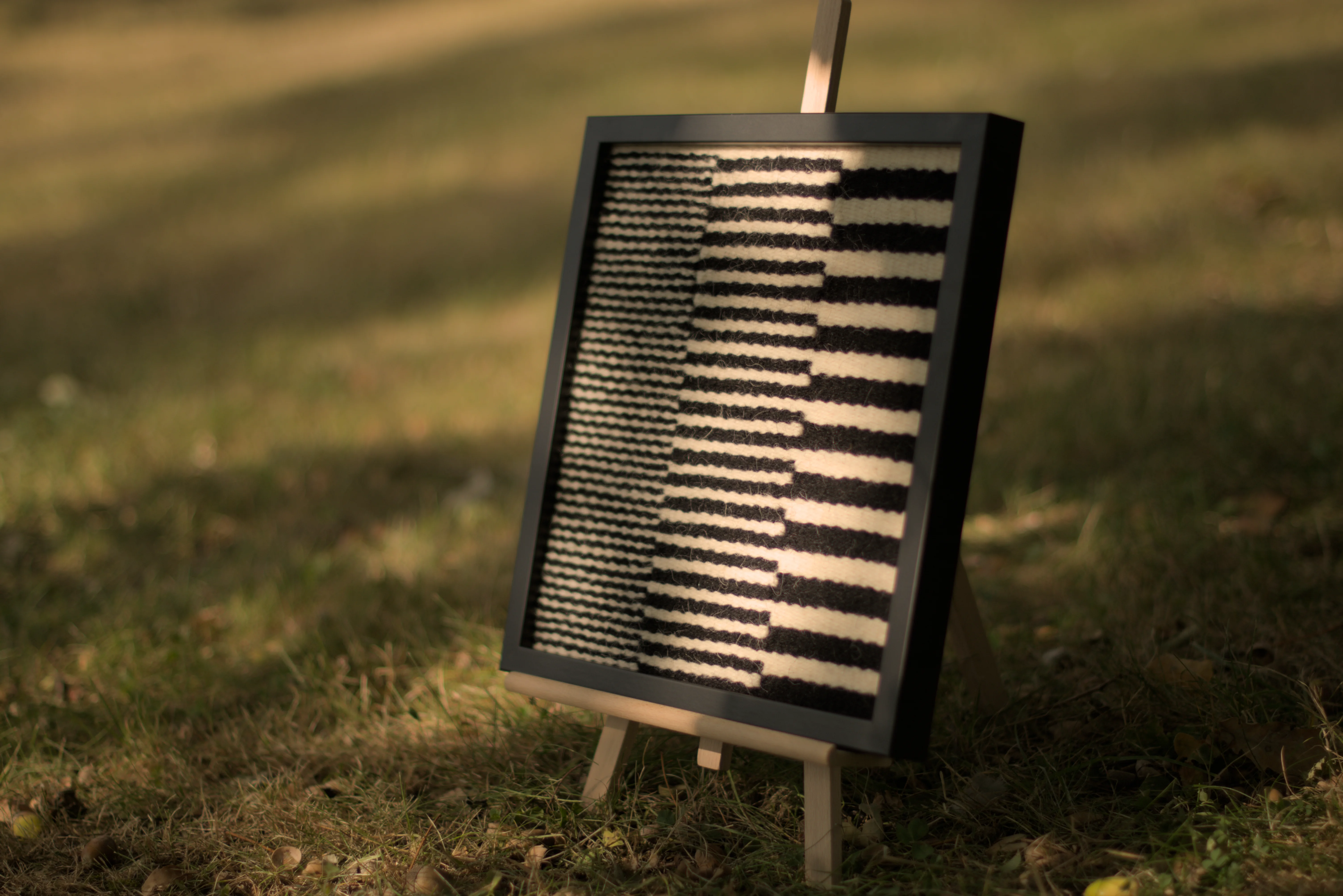 Czarne/Białe – seria miniatur tkackich eksplorujących rytm i napięcie między formami geometrycznymi, wykorzystująca kontrast między dwoma kolorami wełny, czarnym i białym.