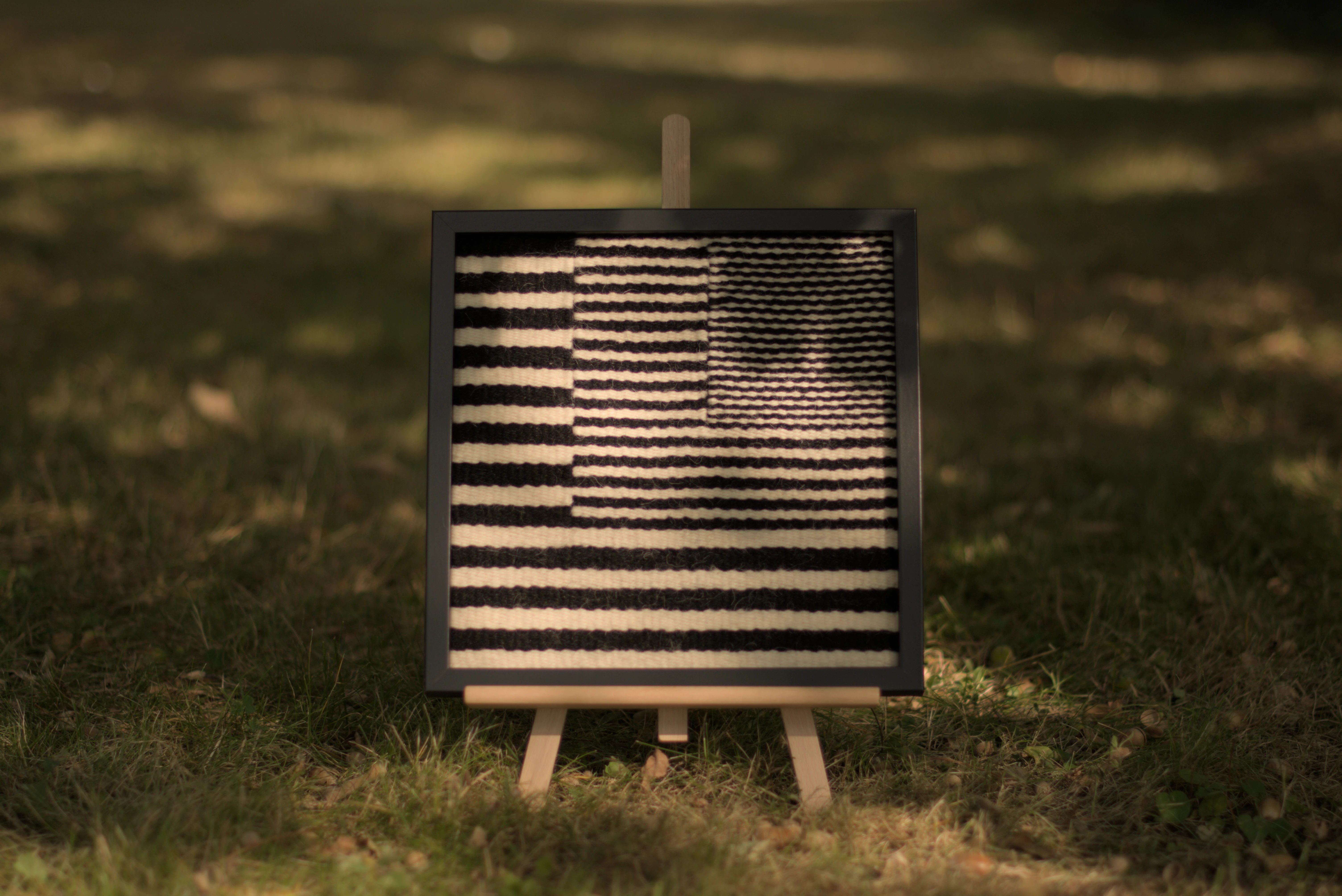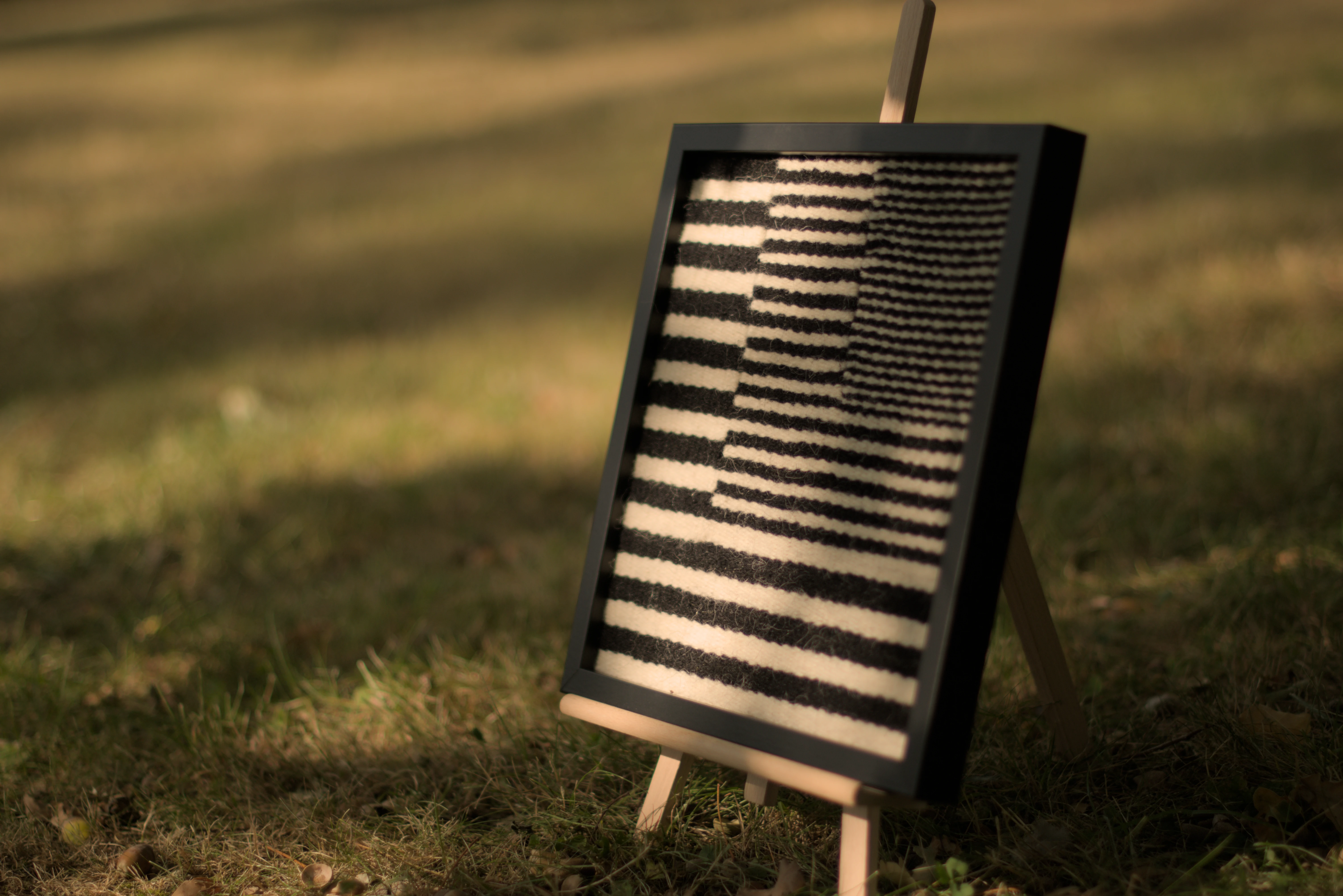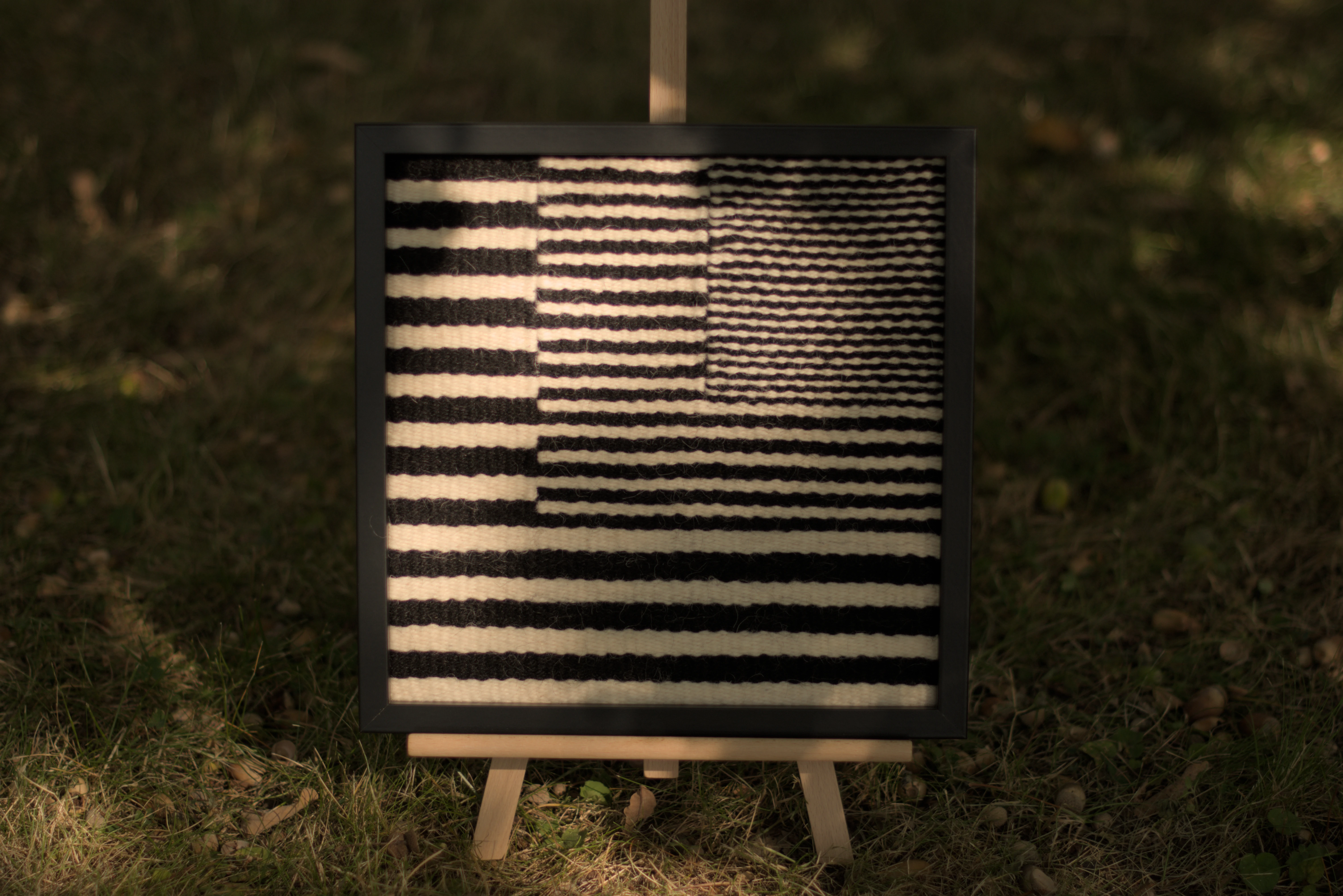 Czarne/Białe – seria miniatur tkackich eksplorujących rytm i napięcie między formami geometrycznymi, wykorzystująca kontrast między dwoma kolorami wełny, czarnym i białym.