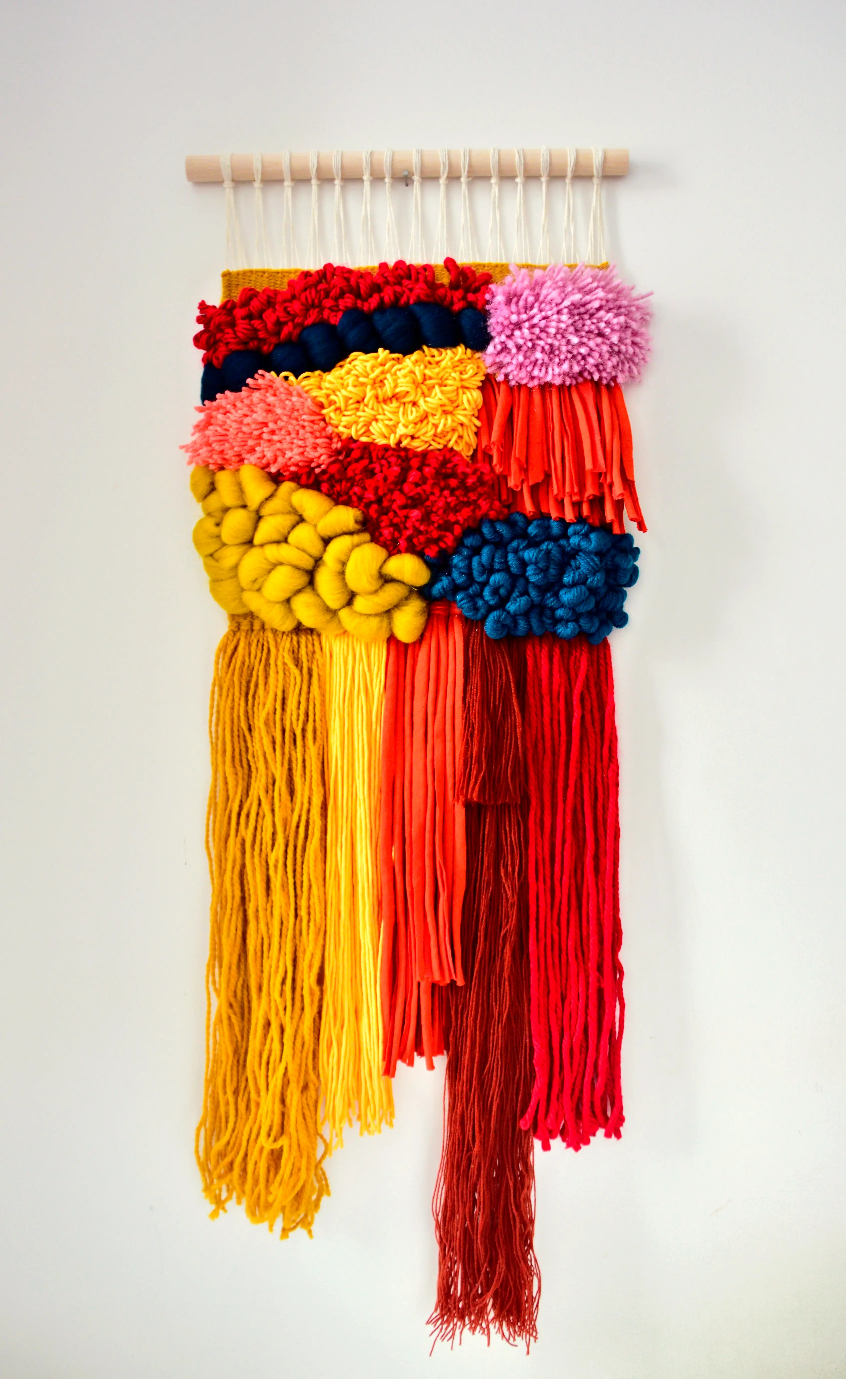 Czerwony i żółty – tkanina artystyczna wykonana ręcznie, w jednym egzemplarzu. Jest pełna ciepłej energii, słońca i optymizmu. Kaskady frędzli oraz rozmaitość splotów i faktur zachęcają do wizualnego oraz fizycznego eksplorowania różnych zakamarków tkaniny. Do jej wykonania wykorzystałam w większości włóczki z recyklingu, tzn. włóczki uratowane przed wyrzuceniem, ze sprutych robótek, swetrów itp., z dodatkiem nowej wełny czesankowej oraz przędzy t-shirtowej.