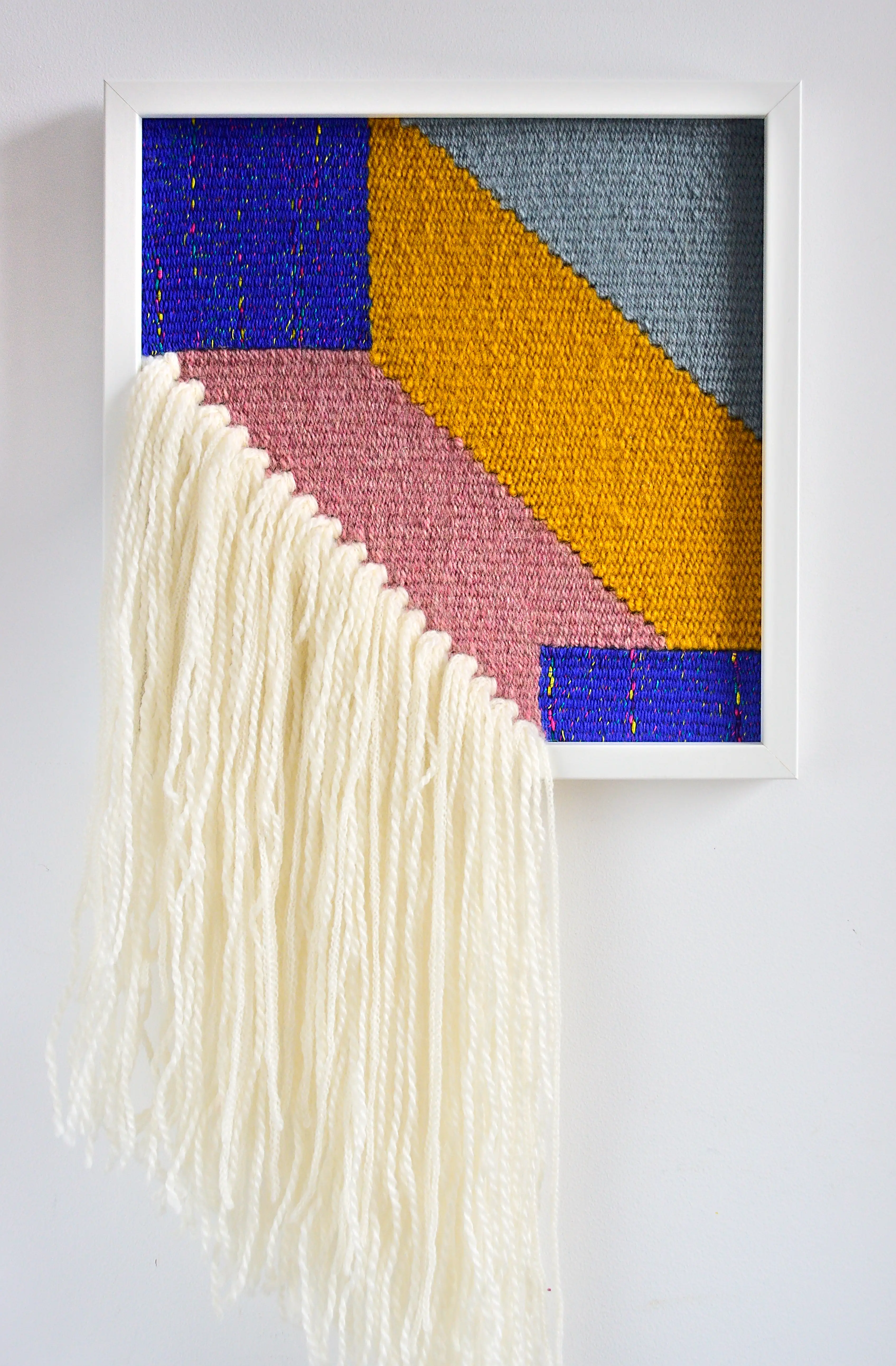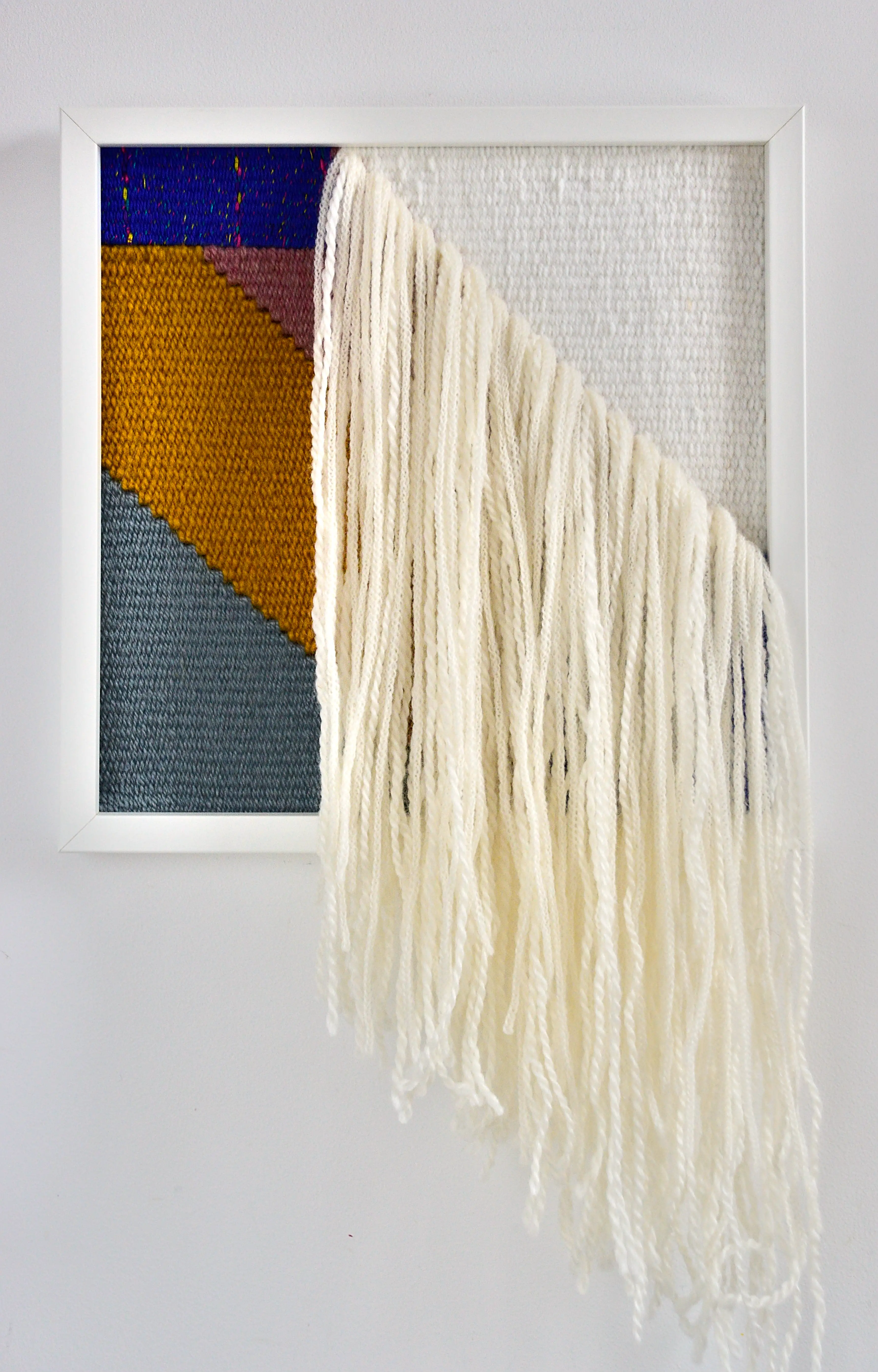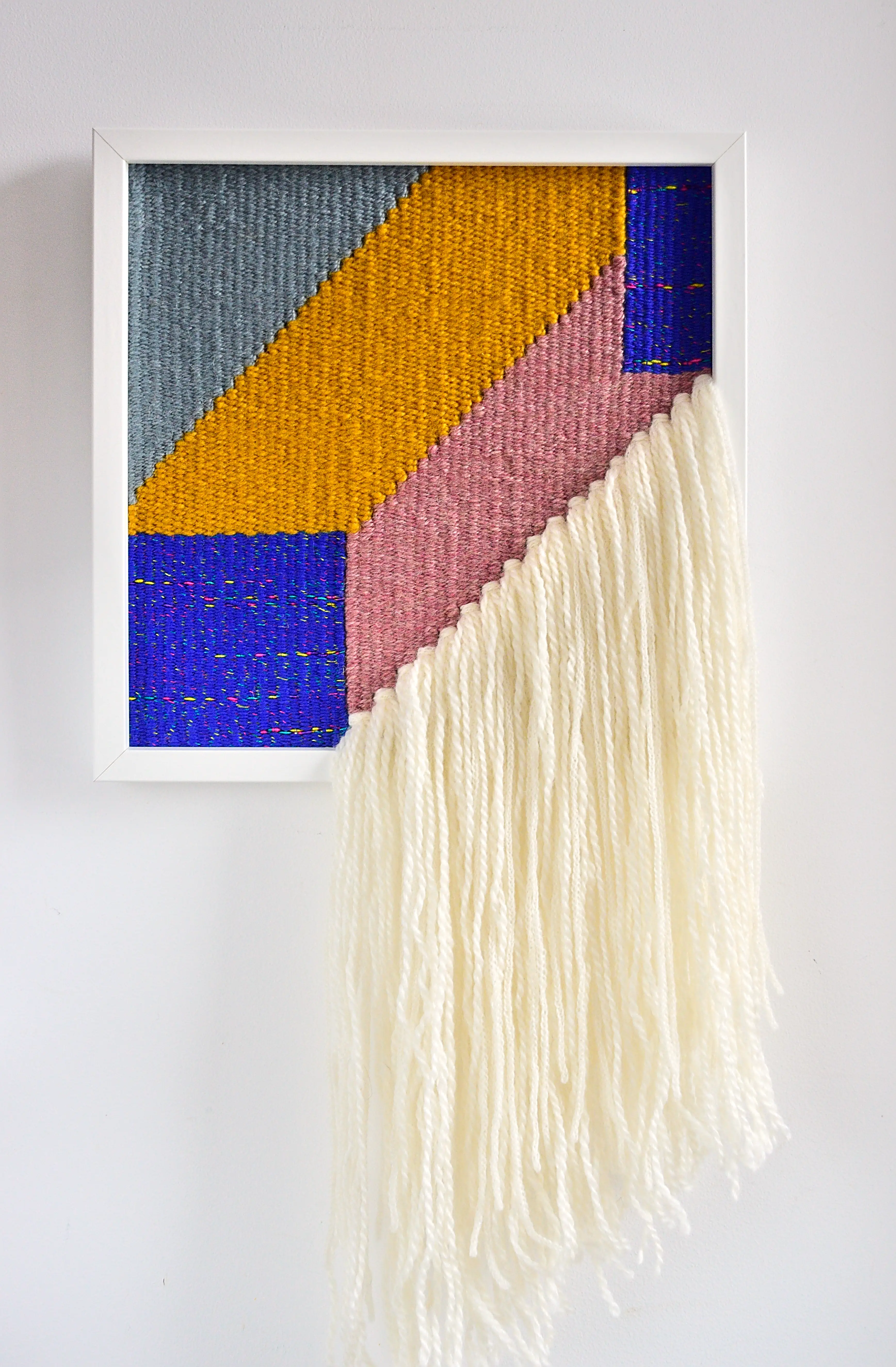 Niebieskie kwadraty – tkanina artystyczna wykonana ręcznie, w jednym egzemplarzu. Oprawiony w białą ramę geometryczny kilim, ozdobiony z jednej strony długimi, białymi frędzlami, został zaprojektowany w taki sposób, by można go było powiesić na kilka sposobów, nawet pod skosem. W każdej wersji frędzle zasłaniają inne fragmenty tkaniny i odsłaniają to, co przy klasycznym powieszeniu mogło być niewidoczne. Dzięki takiemu zabiegowi widz staje się niejako współtwórcą ostatecznego wyglądu dzieła, które może się co jakiś czas zmieniać. Jedna praca, wiele możliwości prezentacji. Oszczędny w formie projekt będzie pasował do nowoczesnego wnętrza. Do wykonania tej tkaniny użyłam częściowo włóczek z recyklingu, które dzięki temu zyskały drugie życie.