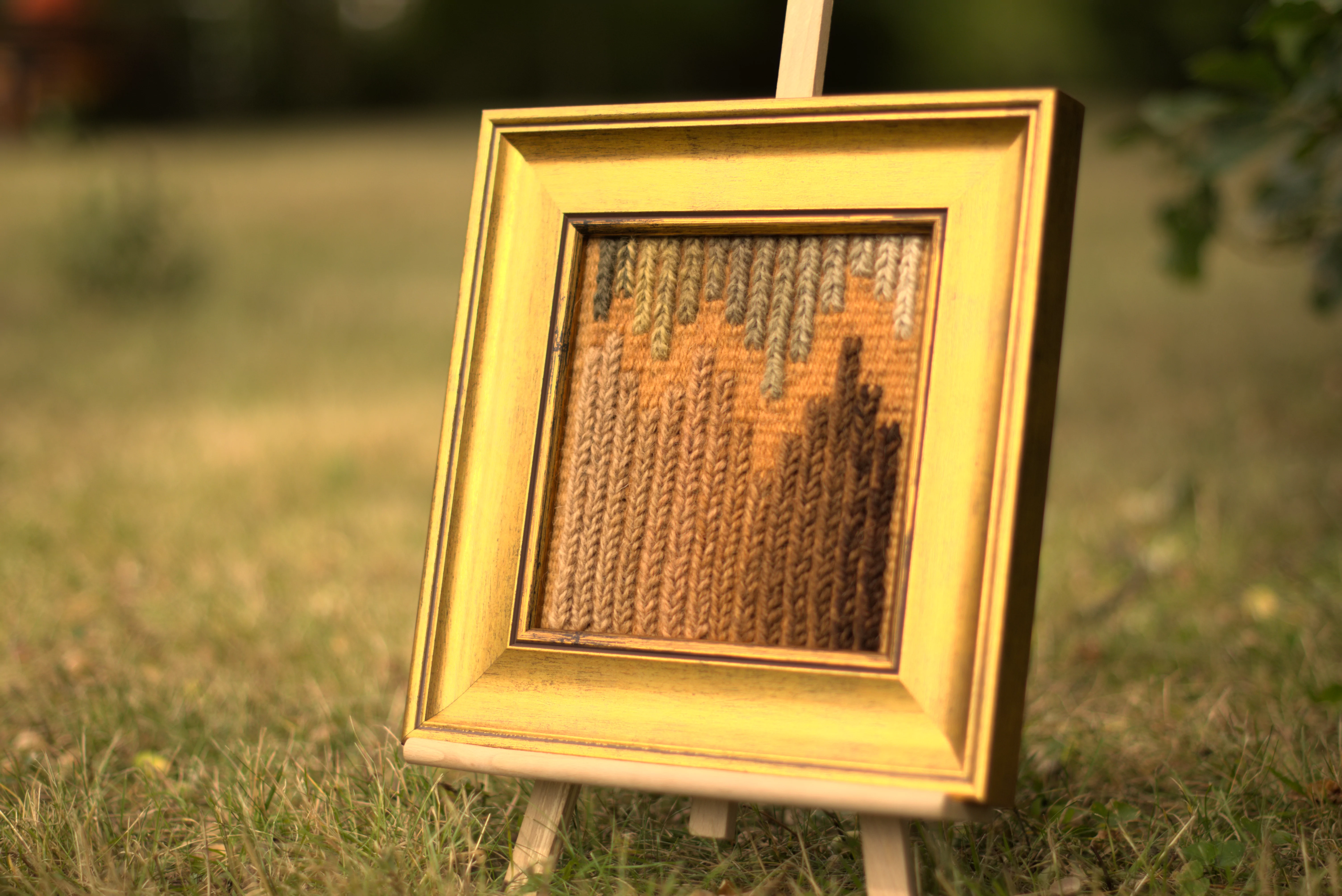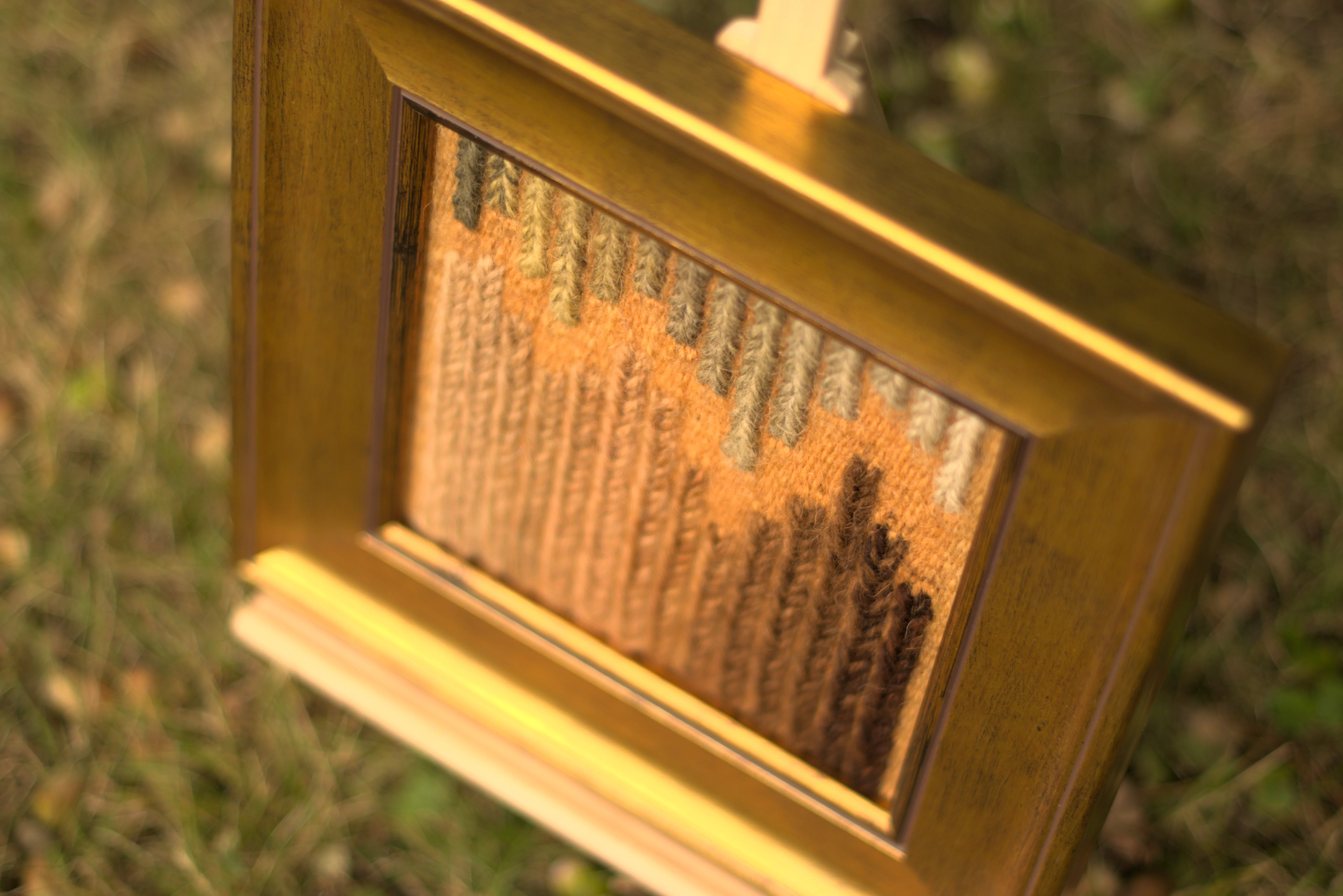 Materiał: żywa wełna owcza (polski producent), własne barwniki roślinne, osnowa bawełniana (polski producent), złocona drewniana rama (polski producent)