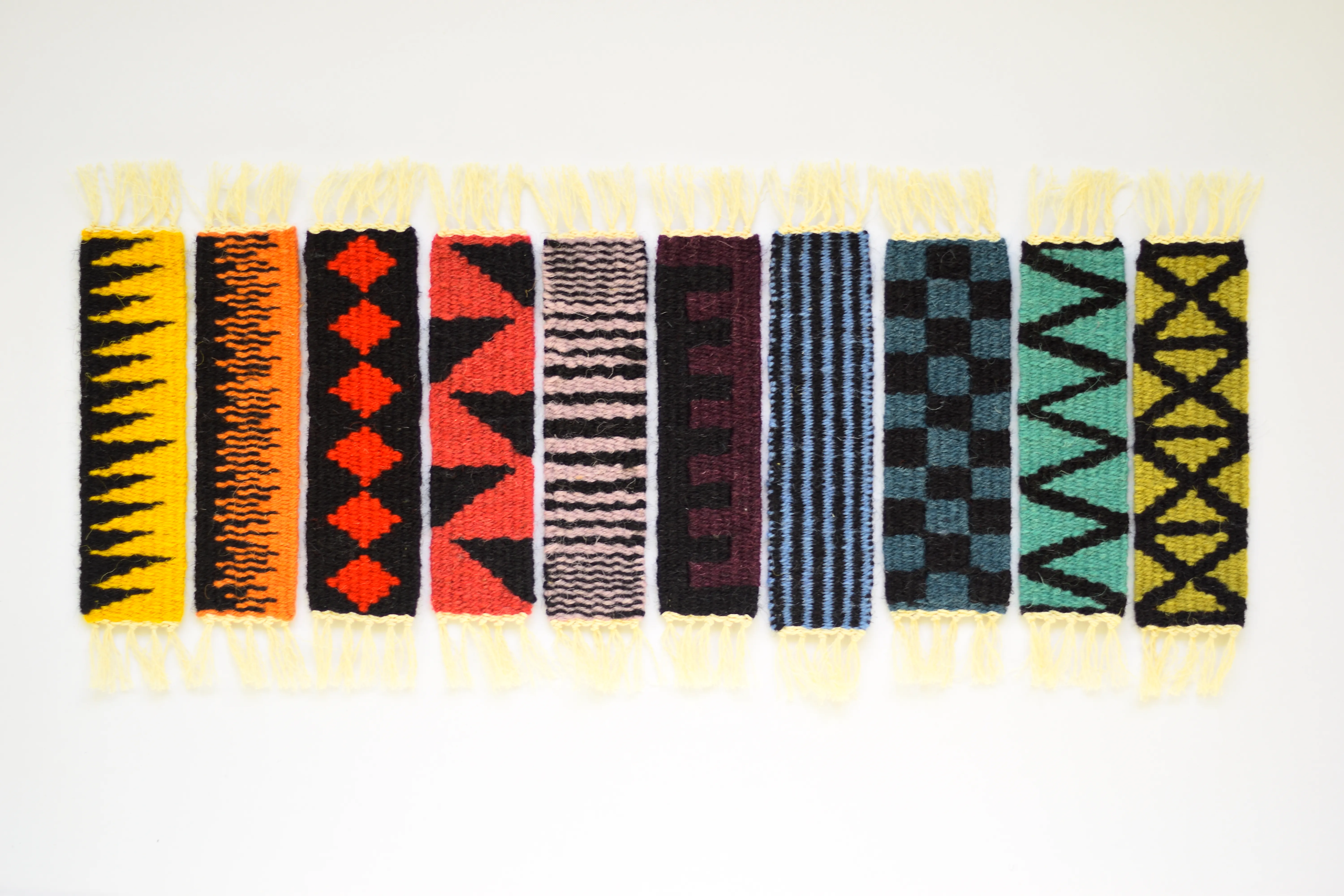 Duo – seria zakładek do książek wykonanych ręcznie, w pojedynczych egzemplarzach. Każda z dziesięciu zakładek powstała w całości z wełny owczej w tylko dwóch kolorach. Czerń połączyłam z intensywną żółcią, pomarańczem, czerwienią, niebieskim, limonkowym i szmaragdowym zielonym, turkusowym, a także z fioletem pastelowym i ciemnym oraz ze zgaszonym różem. Całości dopełniły proste geometryczne wzory oraz rozczesane kremowe frędzelki po obu stronach zakładek.