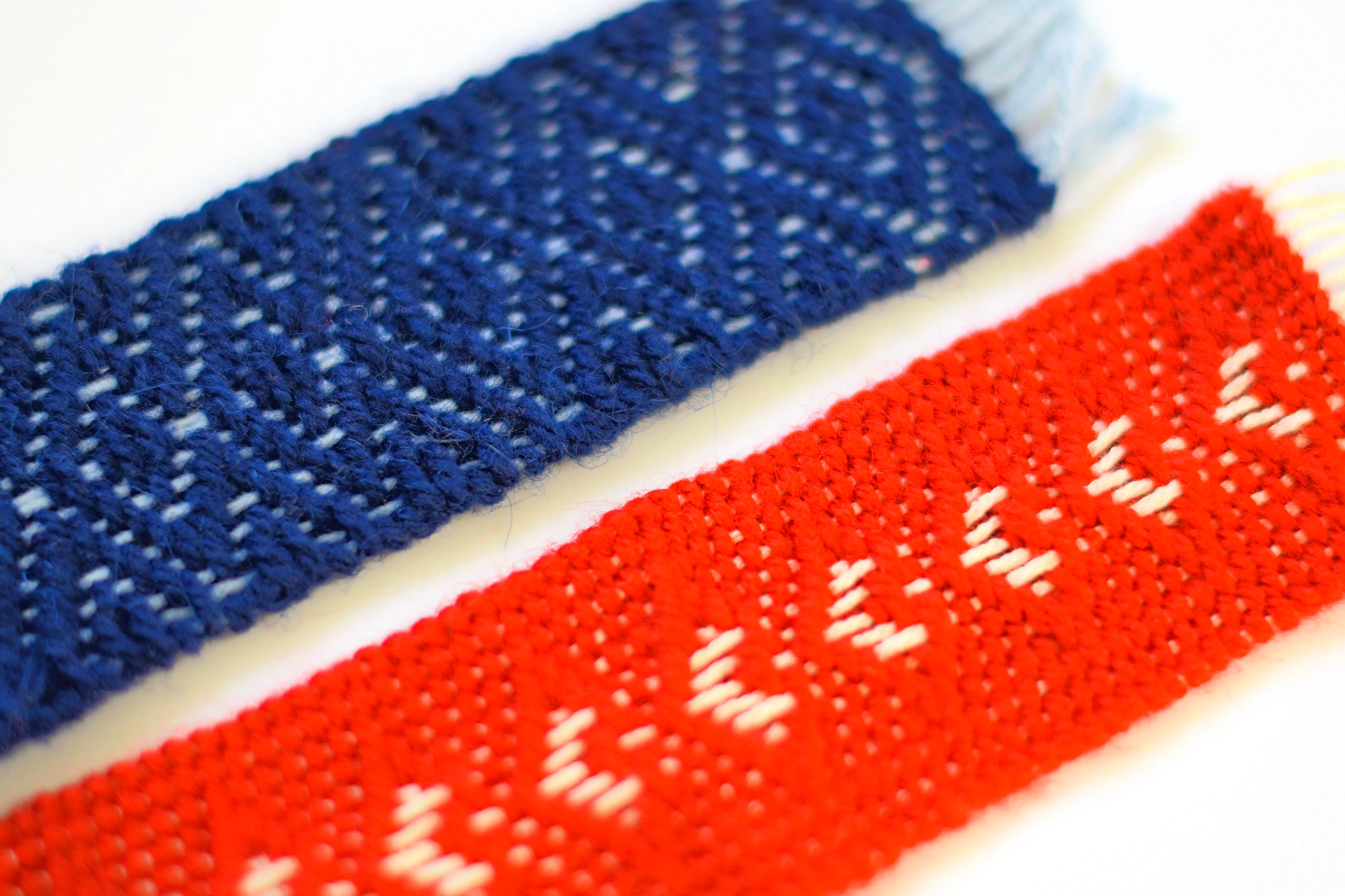 Zakładki do książek utkane ręcznie, w pojedynczych egzemplarzach. Zostały wykonane z cieniutkiej owczej wełny w czterech intensywnych kolorach. Technika overshot pozwala na stworzenie w tkaninie wyjątkowych, wypukłych wzorów, które pojawiają się dzięki zastosowaniu odpowiedniej grubości przędzy oraz powtarzaniu konkretnych układów wątku i osnowy. Konkretne nici osnowy należy podnosić ręcznie (wybierać), by powstał określony wzór.